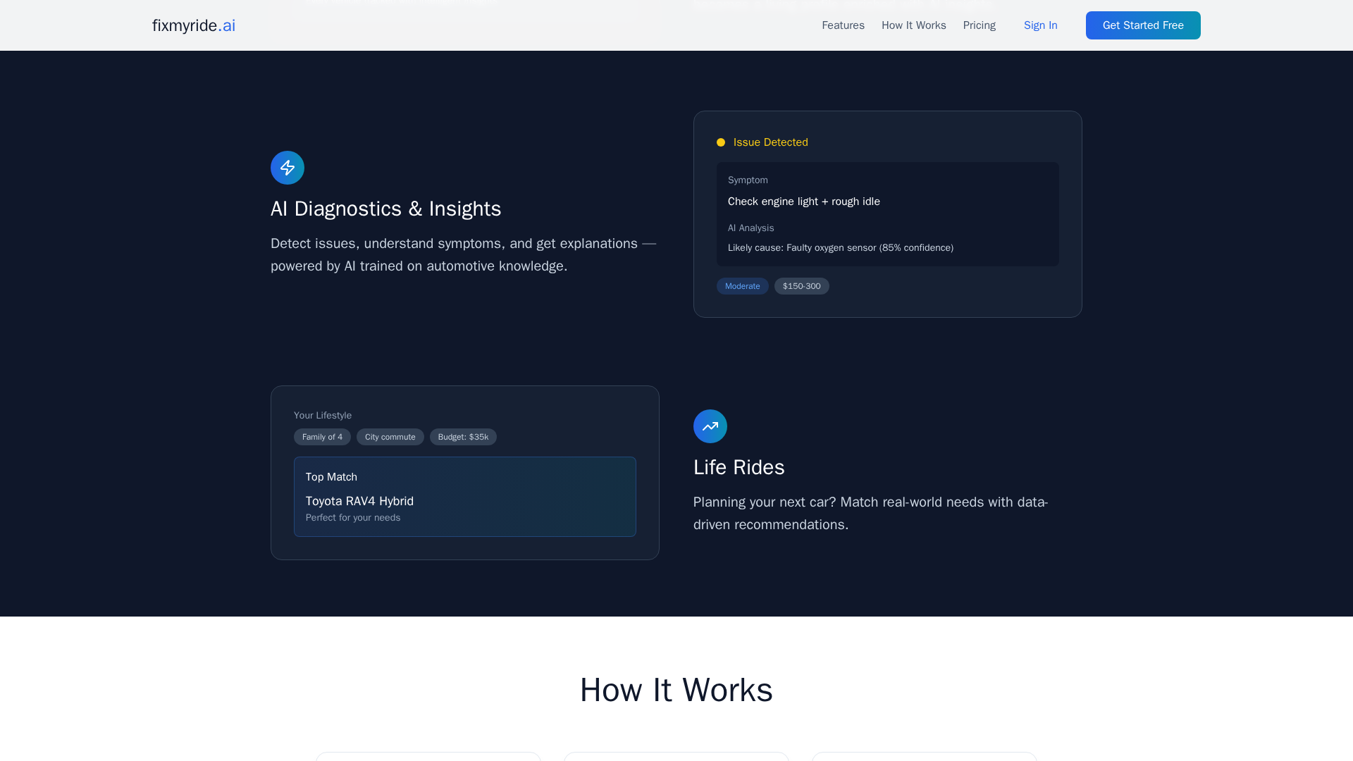 FixMyRide.ai is a cloud-based platform that builds an 'intelligent garage' for car owners. It ingests vehicle identity and diagnostic signals (VIN and diagnostic codes) and uses AI models to translate raw telemetry and trouble codes into plain-language diagnostics, probable causes (with confidence estimates), and actionable maintenance guidance. Users can track multiple vehicles, maintain living vehicle profiles, and explore a separate Life Rides feature for data-driven car discovery and purchase planning. The product emphasizes privacy and data ownership: user vehicle data is kept private and the product is positioned primarily for car owners rather than professional mechanics. It aims to simplify auto diagnostics, reduce time-to-fix, and empower users with insights and planning tools, while offering a transparent view of how AI-derived recommendations were formed. Life Rides provides a data-backed avenue to discover suitable future vehicles, supporting smarter purchase decisions.