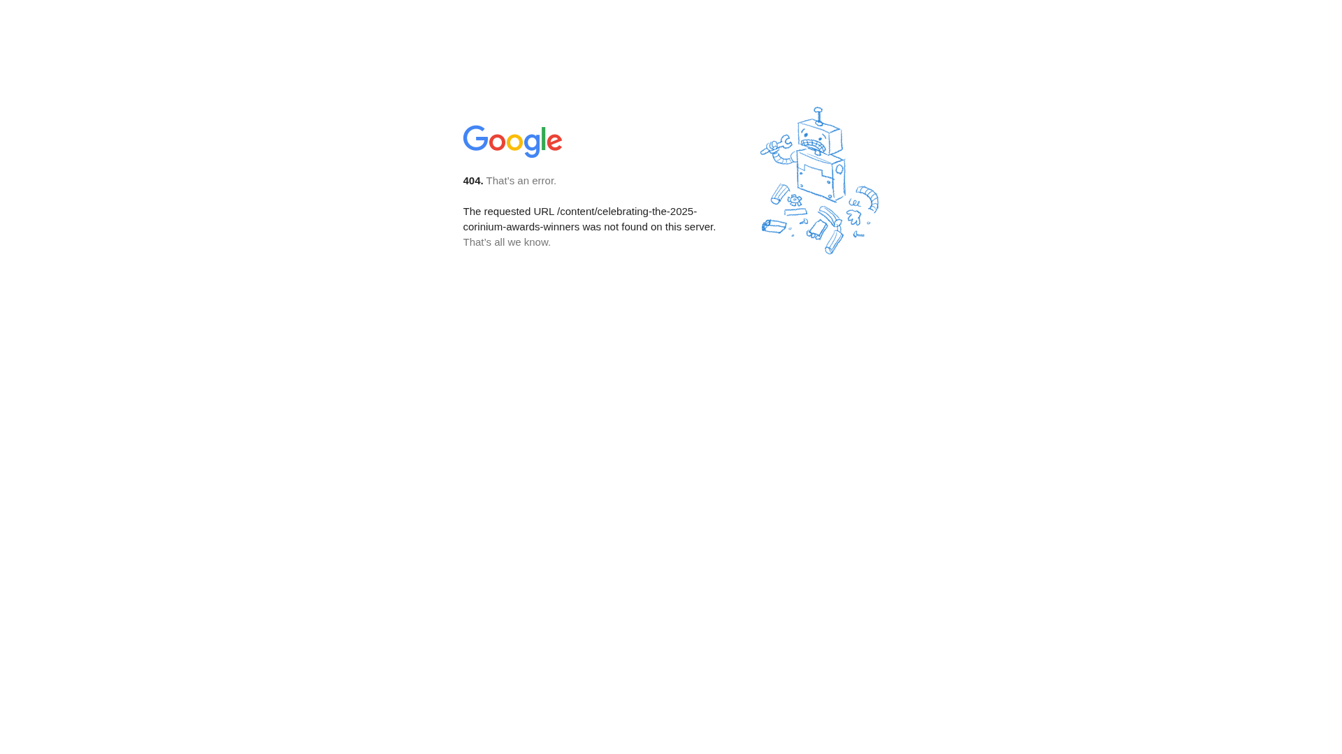 A 404 error confirms the 'Celebrating the 2025 Corinium Awards winners' page is missing.