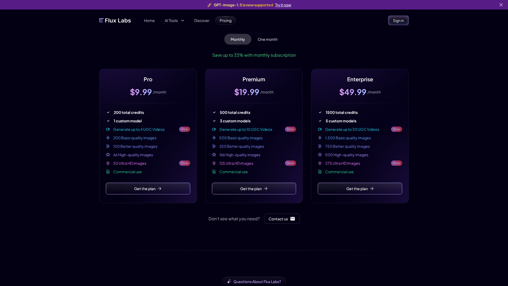 Monthly plan with 1500 credits; 5 custom models; up to 30 UGC videos; image credits: 1500 Basic / 750 Better / 500 High / 375 Ultra HD; commercial use included.