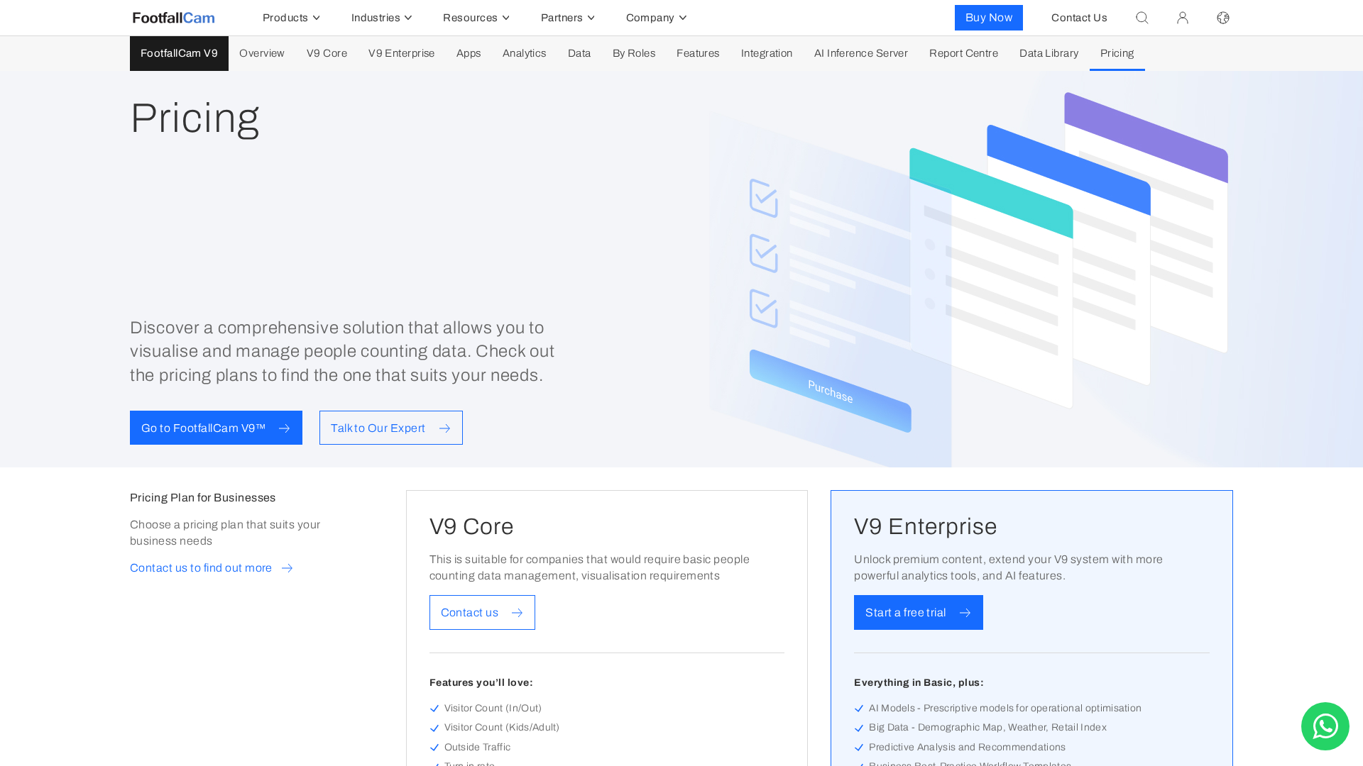 FootfallCam is a UK-founded company established in 2002 that offers a hardware + software platform for people counting and occupancy analytics worldwide. The platform emphasizes privacy-first counting, enterprise analytics (Analytic Manager V9), and a range of in-house people-counting devices. Pricing is not publicly disclosed per-seat or per-device; pricing is presented as tiers with custom quotes for enterprise deployments, and a Free V9 edition is offered. The product suite includes FootfallCam 3D Pro2 and other devices (Centroid, 3D Mini, MeshHub, AI theft detection), along with tools like a Device Calculator and Floor Plan Designer. Core features cover counting metrics (in/out, multi-line, group counting, staff exclusion, etc.), real-time occupancy, queue analytics, demographic analytics, heatmaps, and AI-driven prescriptive/predictive analytics. Developer resources and APIs (V9 Server API, Cube API) are available via the Developer Hub. Deployment supports cloud or self-hosted options, with warranty and optional Premium Support.