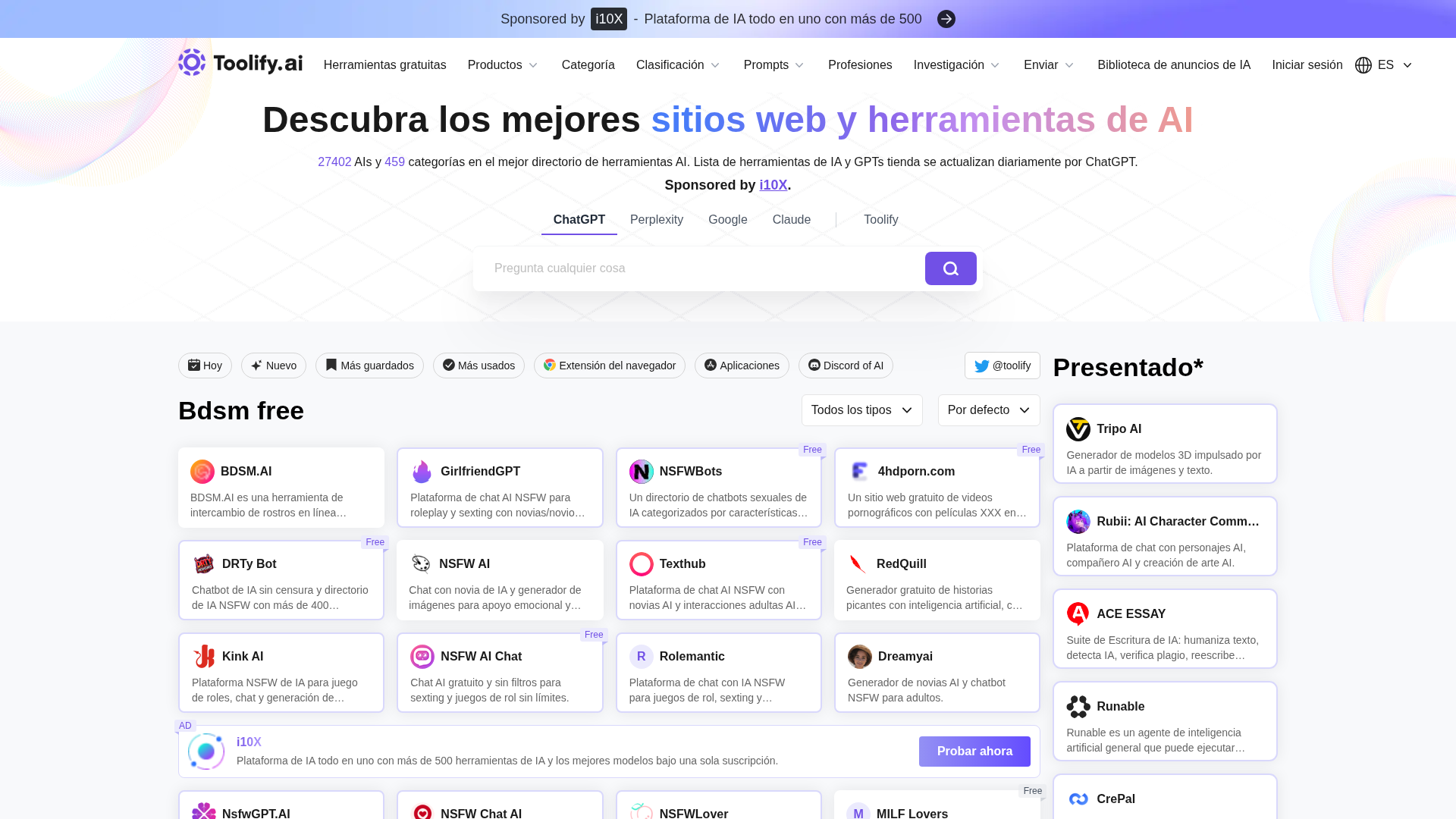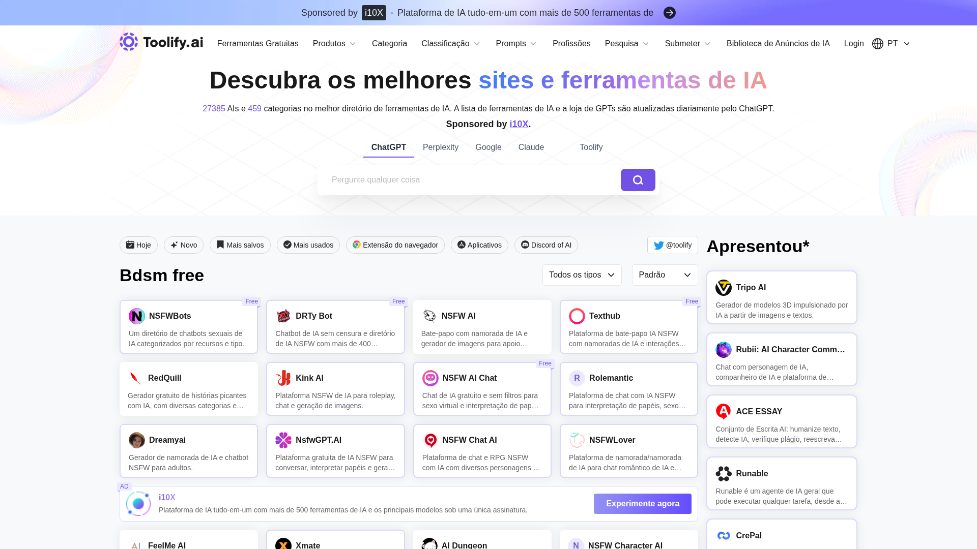 Página patrocinada que apresenta ferramentas de IA gratuitas e plataformas inovadoras, incluindo chat NSFW, gestão de informações e interpretação de sonhos.