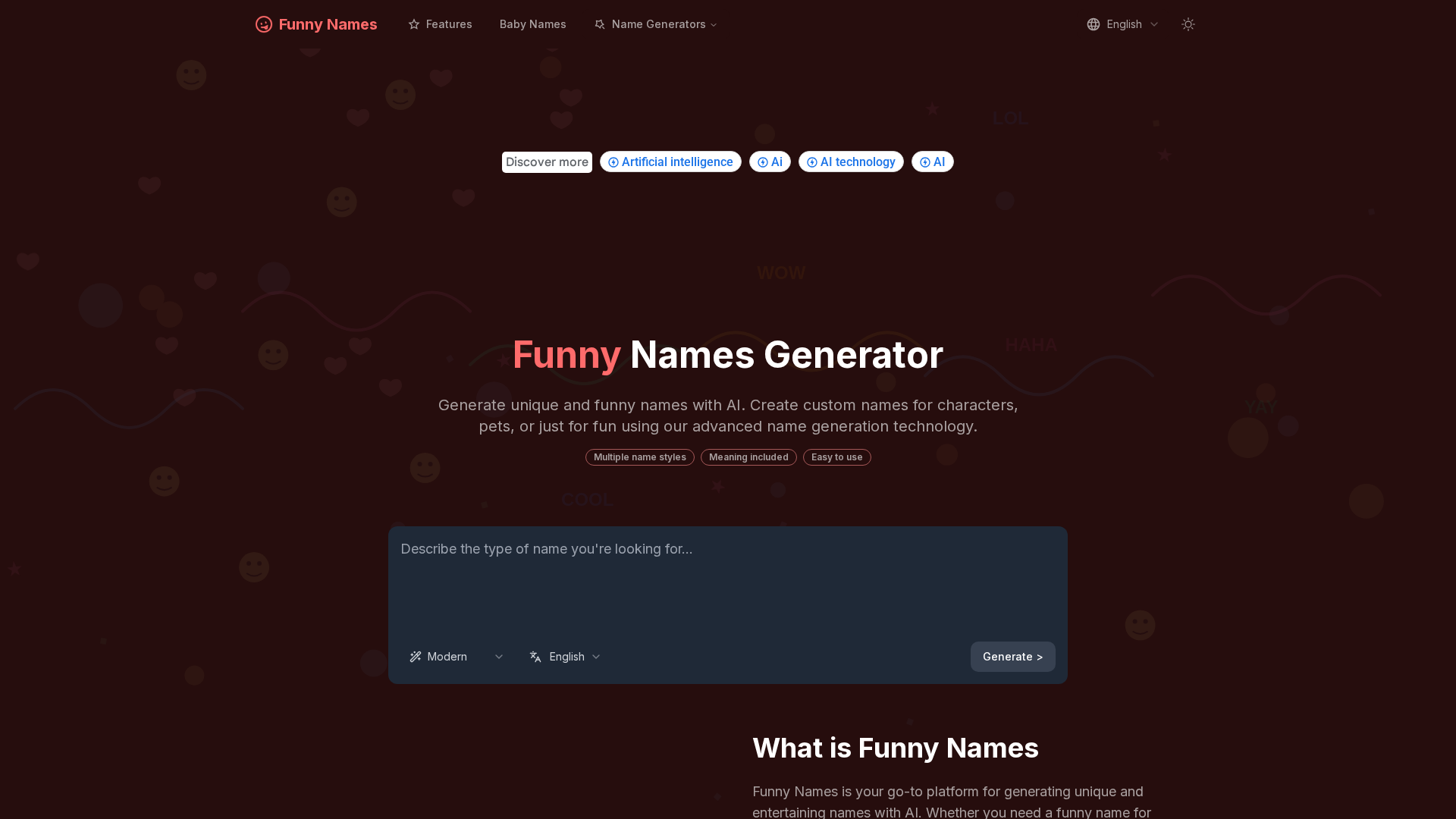 Funny-names.net is an AI-powered name generator that can produce names for characters, pets, teams, devices, and more in multiple styles and languages. Each generated name can include meaning and origin information. It emphasizes instant generation with no login and supports multi-language within a single request. Core offering: an AI name-generator that produces names in styles such as funny, meaningful, fantasy, sci-fi, nature, mythological, puns, pop-culture, food-inspired, and royal/honorific, with accompanying meaning or origin data. Pages and accessibility: the homepage and /funny-cat-names page are available, and /sitemap.xml confirms multilingual structure. However, /pricing, /faq, /privacy, and /contact return 404 (no pricing, terms, or privacy text accessible). The site claims commercial use is permitted on the homepage, but no terms are visible to verify licensing or attribution requirements. Available features include instant generation, style and language selection, and names with meaning/origin/backstory. Gaps include missing pricing/terms/privacy data and lack of clear contact channels, so users should verify terms and privacy before commercial use.