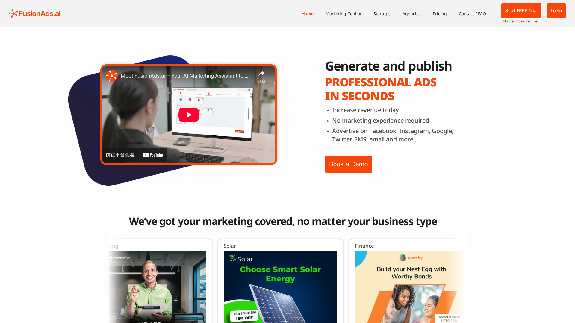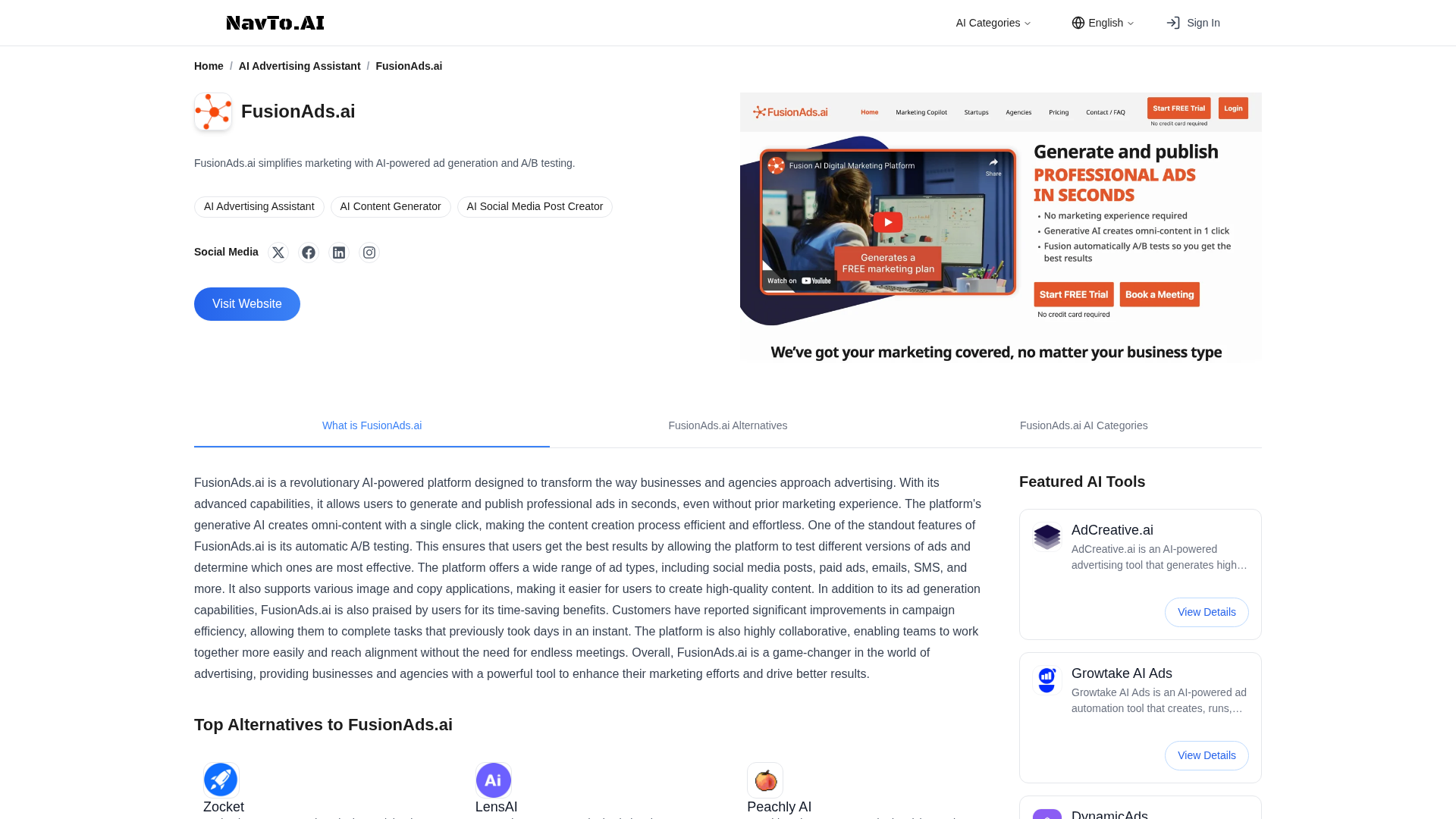 FusionAds.ai is an AI-driven generative advertising platform that creates and deploys omni-channel marketing campaigns in seconds. It scans a website to produce platform-specific creatives and copy (social posts, paid ads, email, SMS) then runs automatic A/B tests to find top-performing variants. The product targets individuals, agencies, and businesses that want fast, data-driven ad creation and optimization without deep marketing expertise. The platform emphasizes one-click omni-content generation, multi-channel distribution, and ongoing automated optimization to accelerate revenue growth.