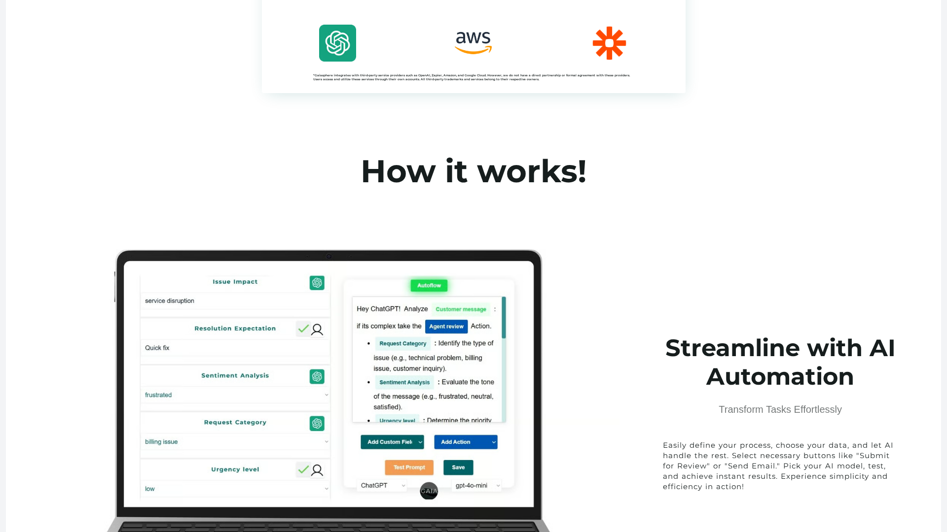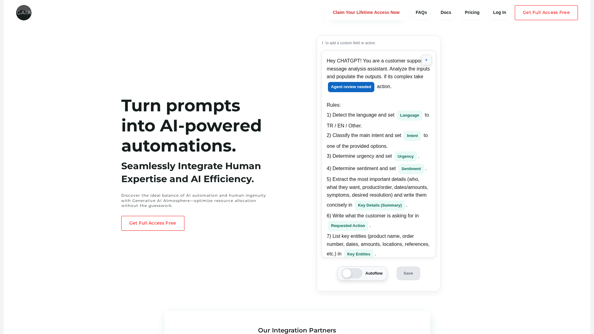 GAIA (GAIA Sphere) provides a Generative AI Atmosphere that combines AI automation with human expertise to help teams design, run, and monitor business workflows without heavy engineering effort. The platform emphasizes no-code/low-code flow creation ("flows" or "flow units"), integrations, real-time tracking and analytics, and tooling for business users to convert prompts and ideas into automated processes. GAIA offers both free full-access usage and paid "flow packages" that scale capacity for teams and enterprises. Governance, monitoring, and human-in-the-loop oversight are emphasized in the platform messaging. Documentation and full article content were not publicly accessible from the site scrapes, so some descriptive elements are drawn from available marketing copy.
