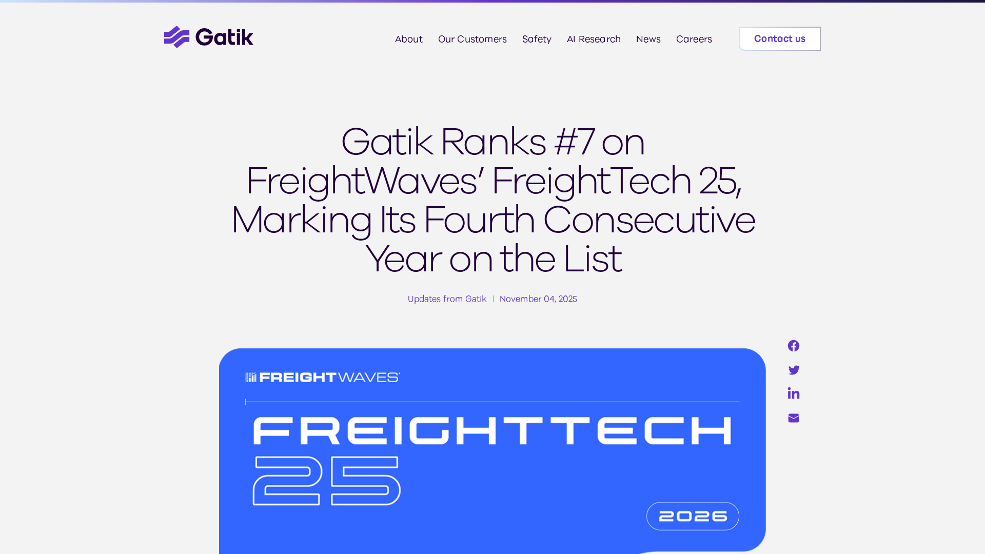 Gatik earns No. 7 on FreightWaves’ FreightTech 25 for its fourth straight Top-10 finish, highlighting scalable autonomous trucking and ATaaS leadership.