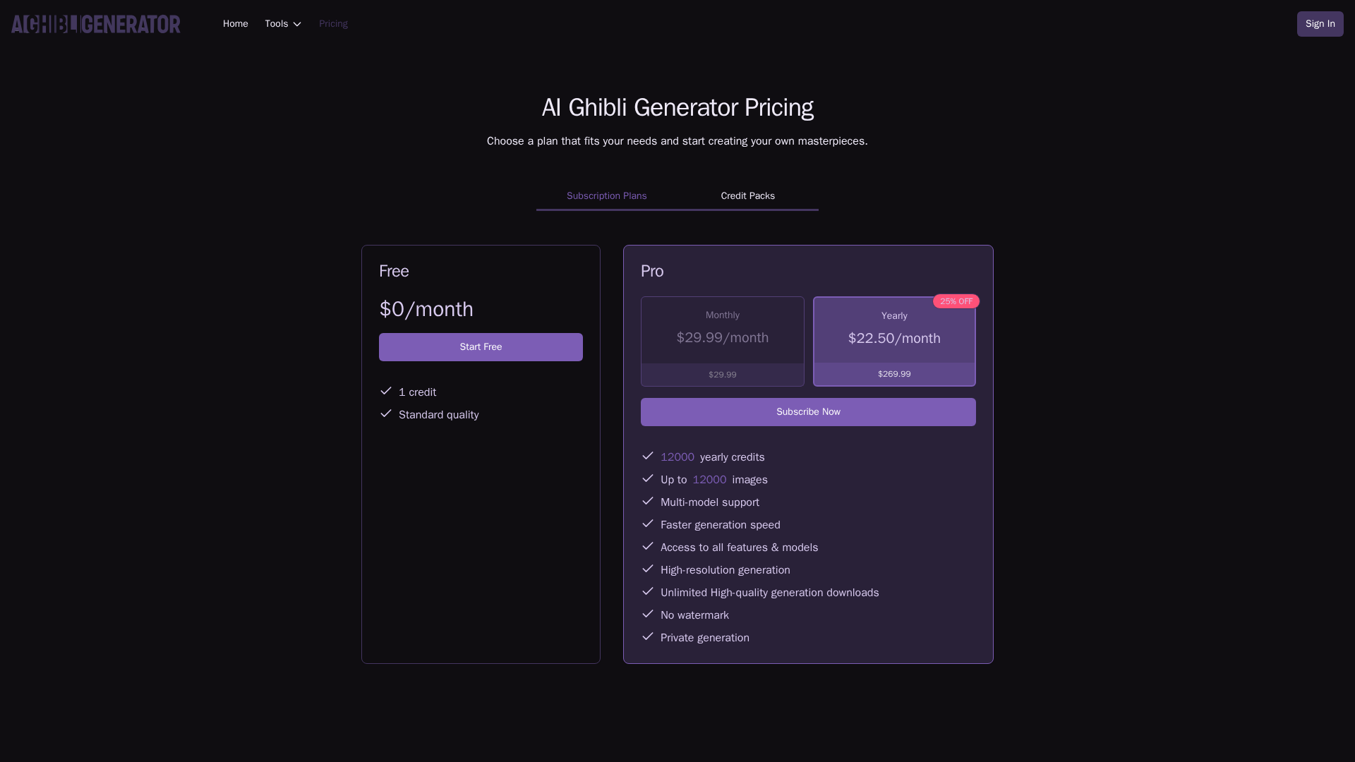 Pro plan with higher credits, faster generation, multi-model access, high-resolution outputs, and no watermark.