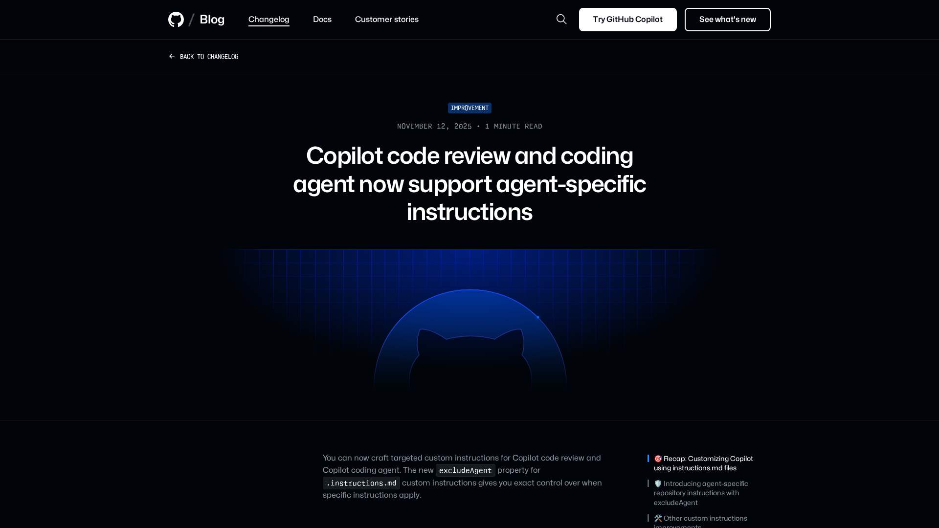 New excludeAgent frontmatter enables agent-specific instructions for Copilot code review and coding agent.