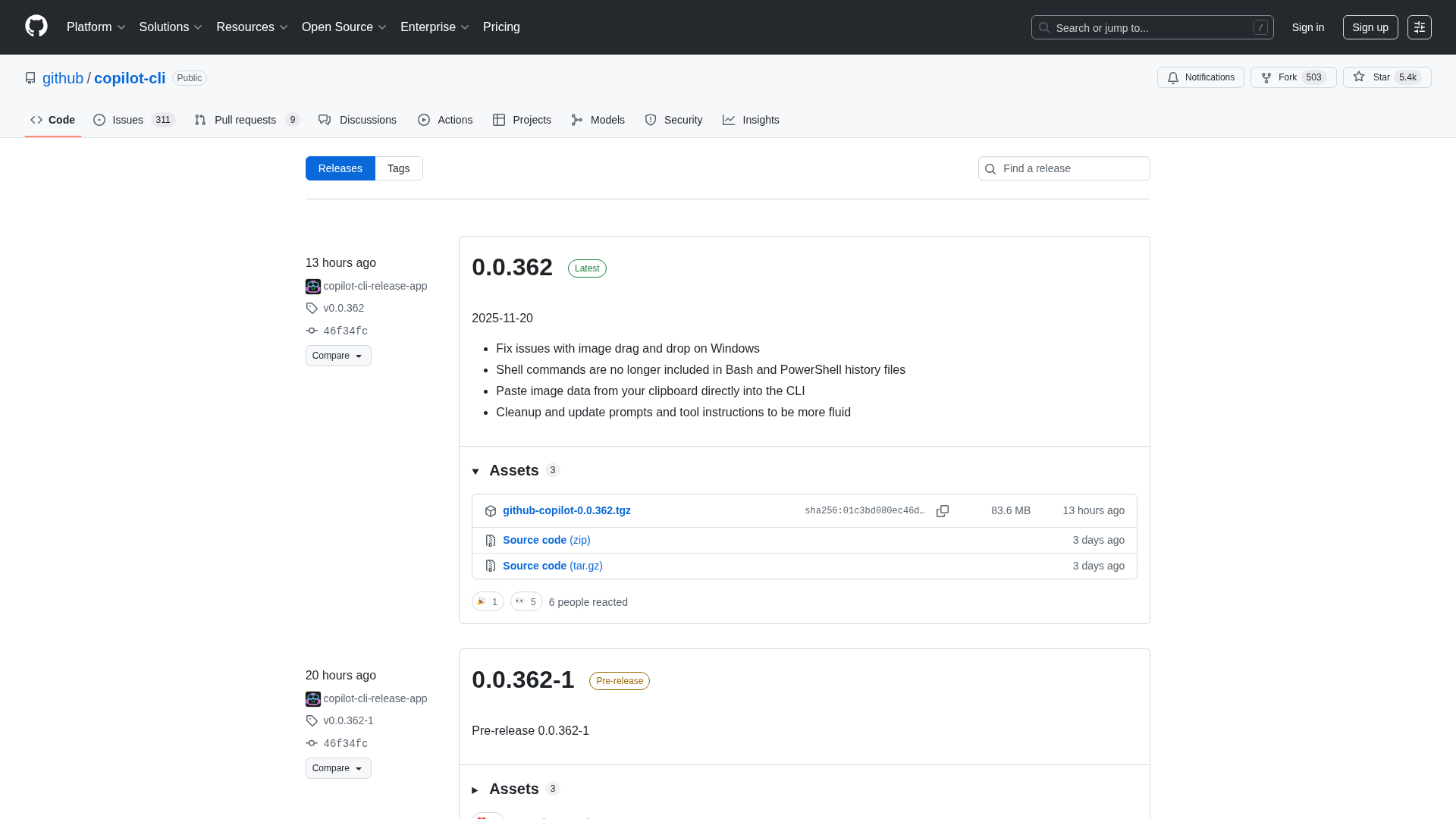 Release notes for GitHub Copilot CLI covering GPT-5.1 availability, feature tweaks, and bug fixes across recent updates.