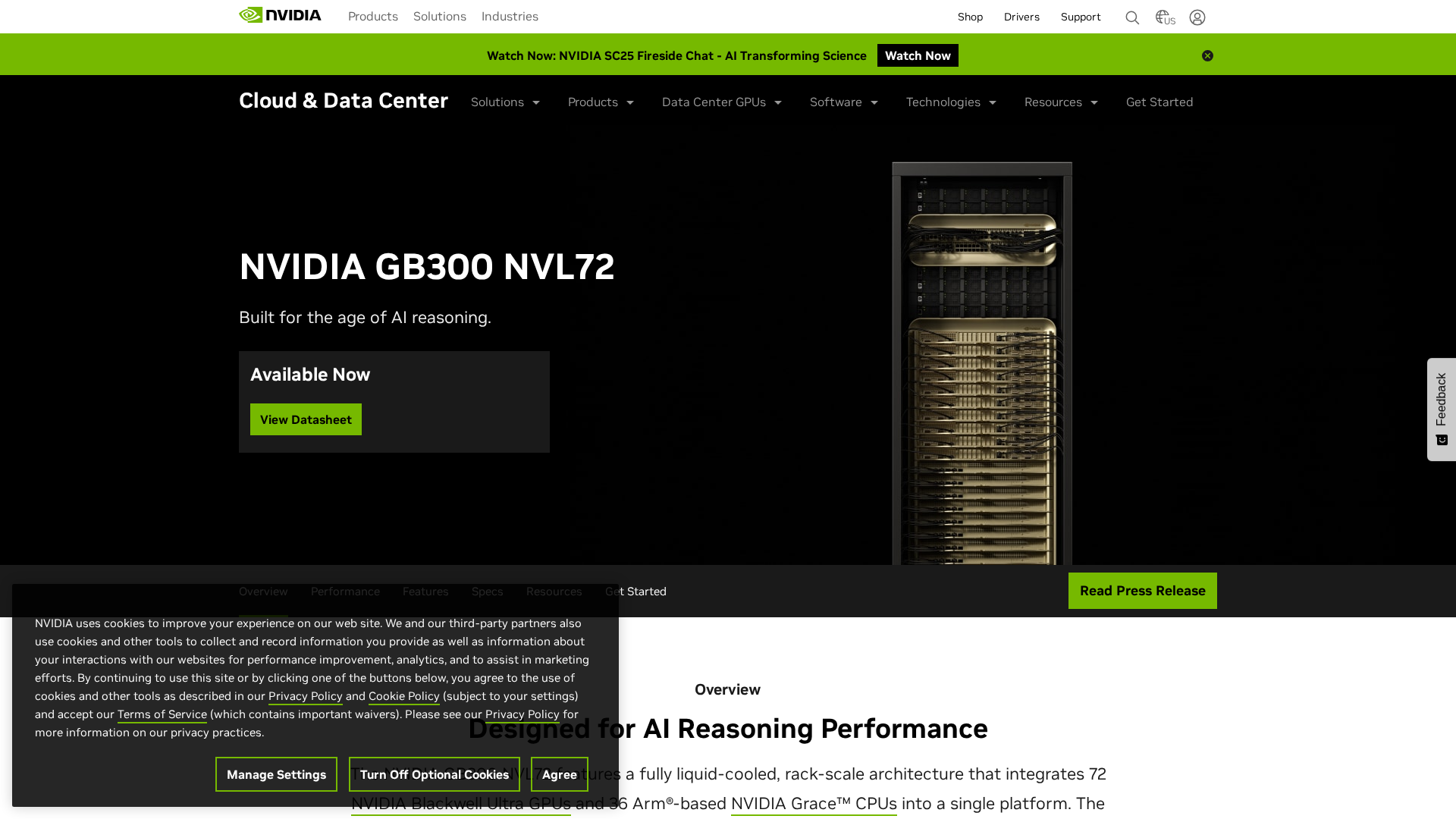 A dense, liquid-cooled AI factory platform with 72 Blackwell Ultra GPUs and 36 Grace CPUs for scalable AI reasoning and inference.