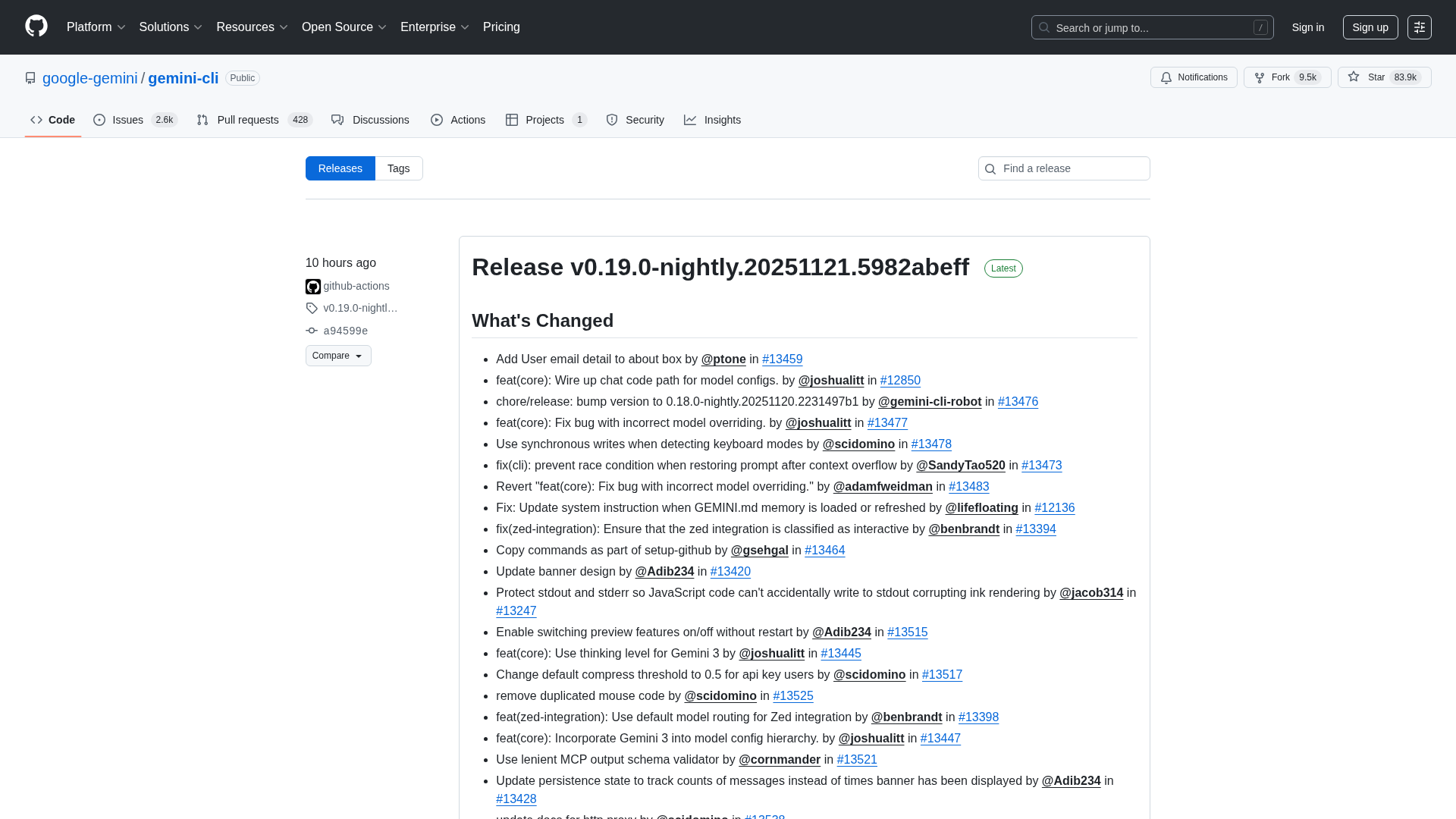 Comprehensive release notes for Gemini CLI, highlighting the latest v0.17.0-nightly update and associated changelogs.