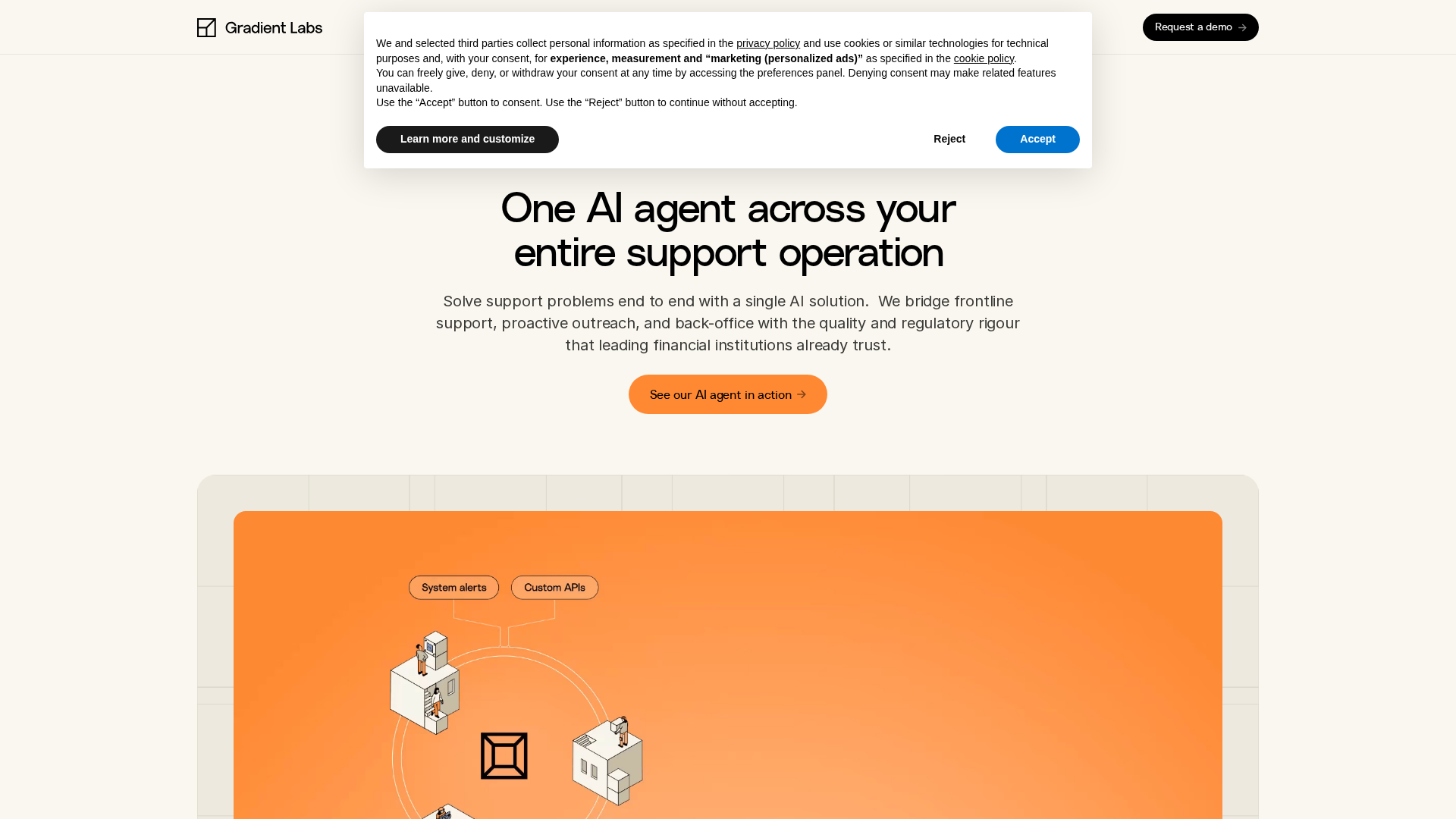 Promotional overview of Gradient Labs' enterprise AI agent for financial services, highlighting high CSAT, compliance, and security features.