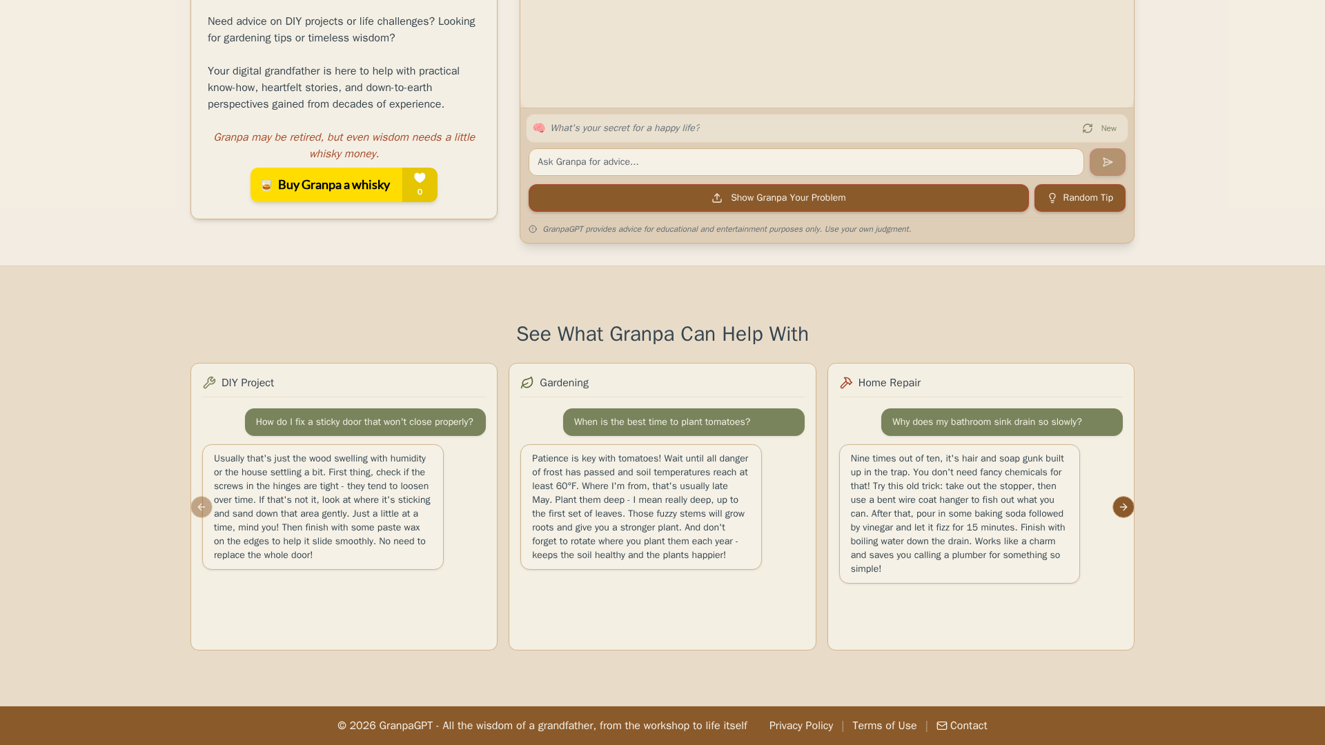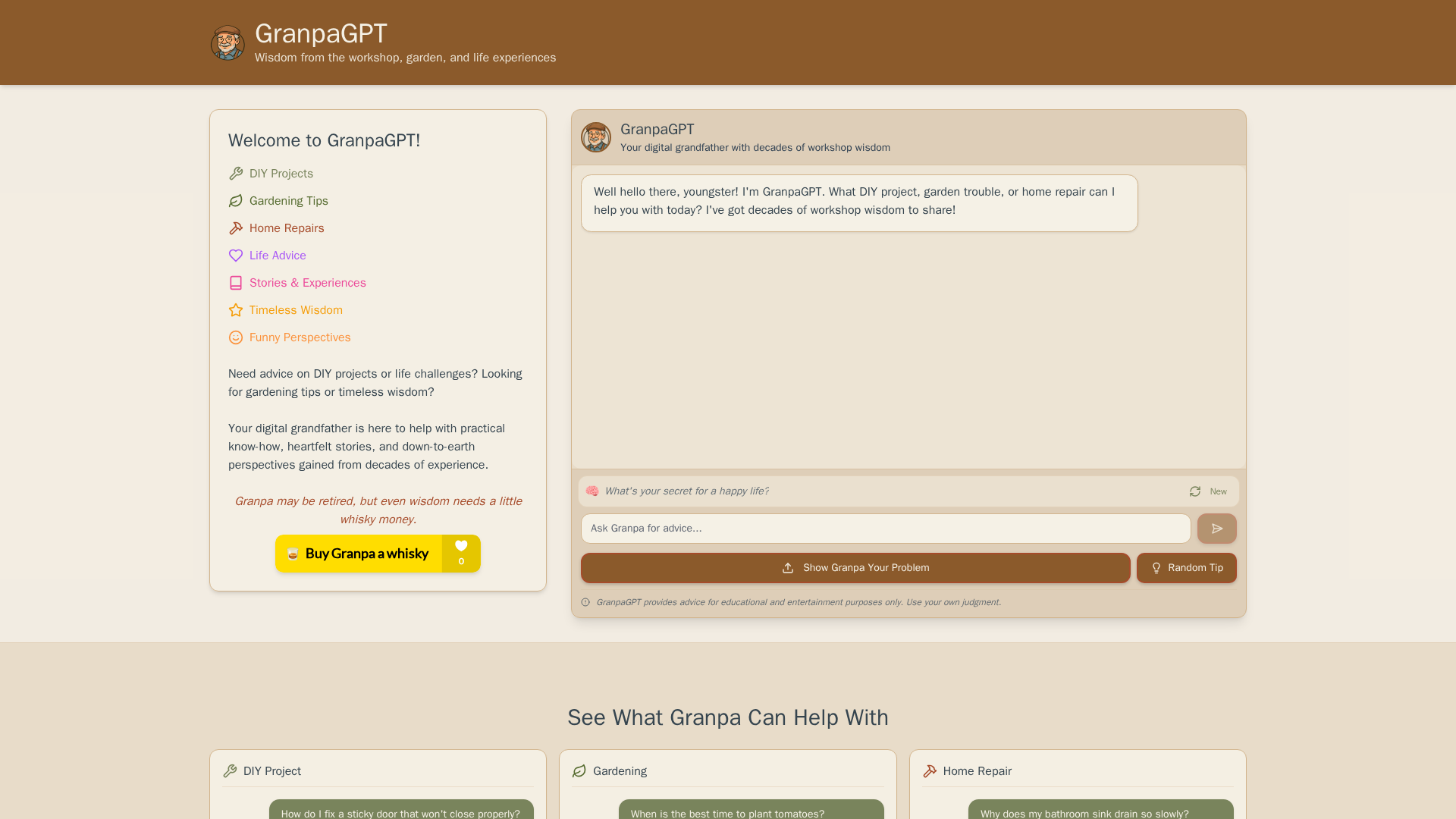 GranpaGPT presents an approachable “grandpa” persona offering plain-language life advice, frugal-living and mindset tips, and beginner-friendly DIY/home-improvement tutorials (tools, steps, safety notes, timelines/costs). Tone is warm, practical, and humorous.