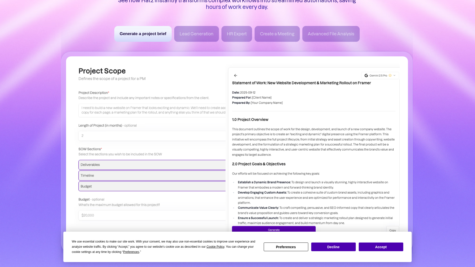 Library of prebuilt templates and use-case examples (lead gen, HR, meeting creation, file analysis, RFP responses, etc.).