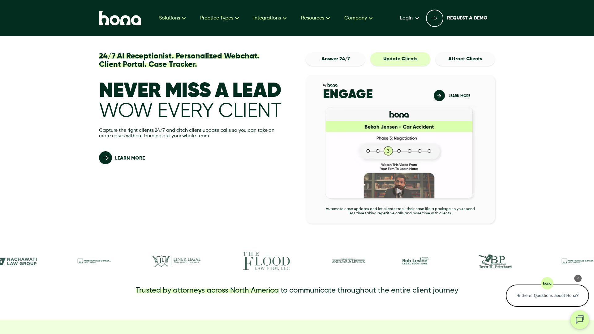 Hona is an AI-powered client-communication platform marketed to law firms as a 24/7 AI receptionist, client portal, and case tracker. Key publicly documented modules and capabilities include a Voice AI receptionist for 24/7 call intake and automated voice intake; Leads, a branded webchat to capture leads and automate follow-up with syncing into firm CRMs; Engage, which provides automated forms and e-signatures to onboard clients and reduce manual data entry; and a Client Portal / Case Tracker that offers real-time case tracking, automated text updates, and workflow triggers. The site emphasizes integrations with CRM and CMS systems but the public pages reviewed summarize integration capability rather than listing specific partner integrations. Claimed benefits on the site include reduced phone volume, fewer repetitive communications, approximately 50% increase in bandwidth for case managers, ~100 hours saved per week via automated forms, and a reported 57% increase in 5-star Google Reviews after 30 days using Engage. Publicly available contact and legal information includes an email ([email protected]), a physical address (553 Timpanogos Cir Suite 2300, Orem, UT 84097), and links to Privacy Policy and Terms of Use in the site footer. A Crunchbase entry (referenced) lists the legal name as Hona Software, Inc. and founders as Joshua Christensen, Manny Griffiths, and Matt McClellan; the marketing site itself does not list founders or founding year. What could not be found on public pages reviewed: concrete pricing plans or per-seat/per-month pricing, a detailed list of specific CRM/CMS partner integrations on the pages reviewed, public security/compliance attestations (e.g., SOC 2, HIPAA), and technical API documentation or developer integration docs. Recommended next steps from the review include requesting a demo and formal pricing from sales, obtaining a detailed integrations list and API/technical docs, confirming security/compliance details, and requesting customer references, contract templates, and DPAs as needed.