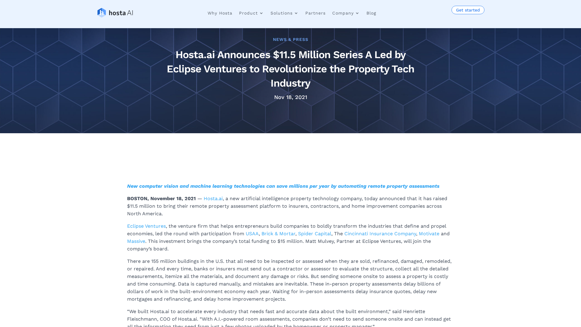 Hosta.ai secures $11.5M Series A led by Eclipse Ventures to enable AI-driven remote property assessments for insurers and contractors.