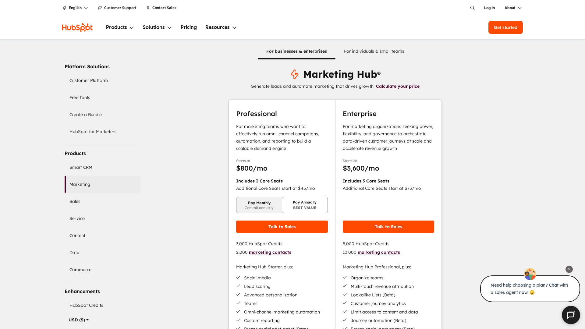 Professional tier with 3 seats included: personalization, search optimization, customer agent.