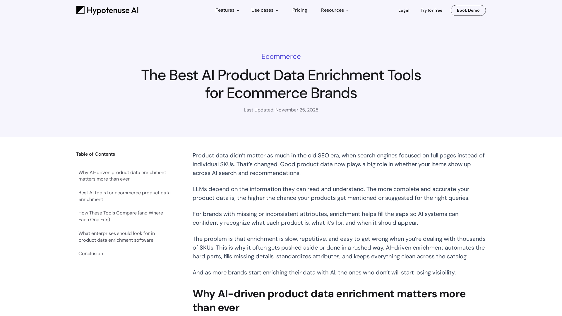 Hypotenuse AI is an AI-first platform focused on ecommerce product content and catalog data workflows. It provides bulk generation of product descriptions, bullet points, collection copy, SEO metadata, translations/localizations, image overlays and edits, and other marketing content. Core capabilities include CSV/XLSX bulk import and export, brand-voice and tone customization, SEO research and optimization, attribute enrichment (AI-PIM features such as classification, standardization, validations, and taxonomy alignment), image editing tools (background removal, staging, overlays), governance features (roles, permissions, workflows, approvals), and a REST API for programmatic integrations and bulk operations. The company emphasizes enterprise functionality and security (SOC 2 referenced, encryption at rest and in transit, customer data ownership and non-use for model training) and supports integrations with platforms such as Shopify, Salsify, and SFCC as well as bidirectional connectors to ERPs, CMSs, and PIMs. Hypotenuse was founded in 2020 and lists CEO/co-founder Joshua Wong (YC S20). There is a 7-day free trial available for first-time users; enterprise and high-volume ecommerce plans use custom pricing and require sales engagement for tailored quotes. Documentation and developer resources are available via the help center and API/developer pages, though some top-level docs/features URLs were noted as returning 404s in the extraction checks.