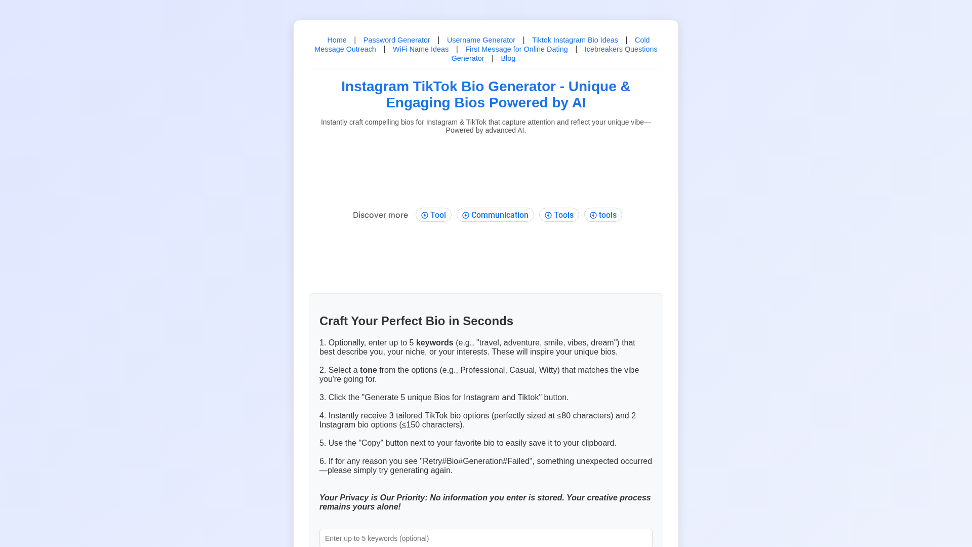 An AI-powered bio generator that creates five ready-to-use bios in a single run: three TikTok bios (limited to 80 characters) and two Instagram bios (limited to 150 characters). It supports optional input of up to five keywords to tailor results to your niche, and offers 7+ tone options such as Professional, Friendly, Witty, Inspirational, Creative, Attitude, and Cute. The UI includes a Generate button, a Copy button for easy clipboard saving, and a Retry path if generation fails. Privacy-focused: user-entered information is not stored. The tool is free to use with a single Free plan, and is part of a broader tools hub for usernames, bios, icebreakers, password/WiFi helpers, etc.