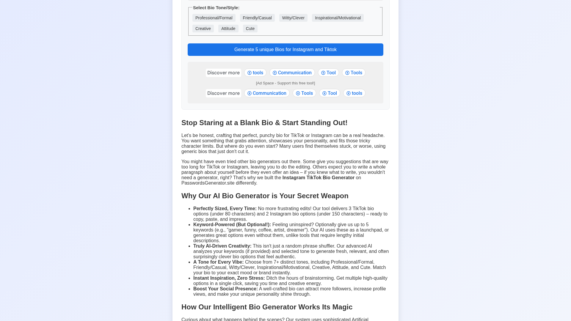 - ✓Instant generation of five bios (3 TikTok, 2 Instagram)