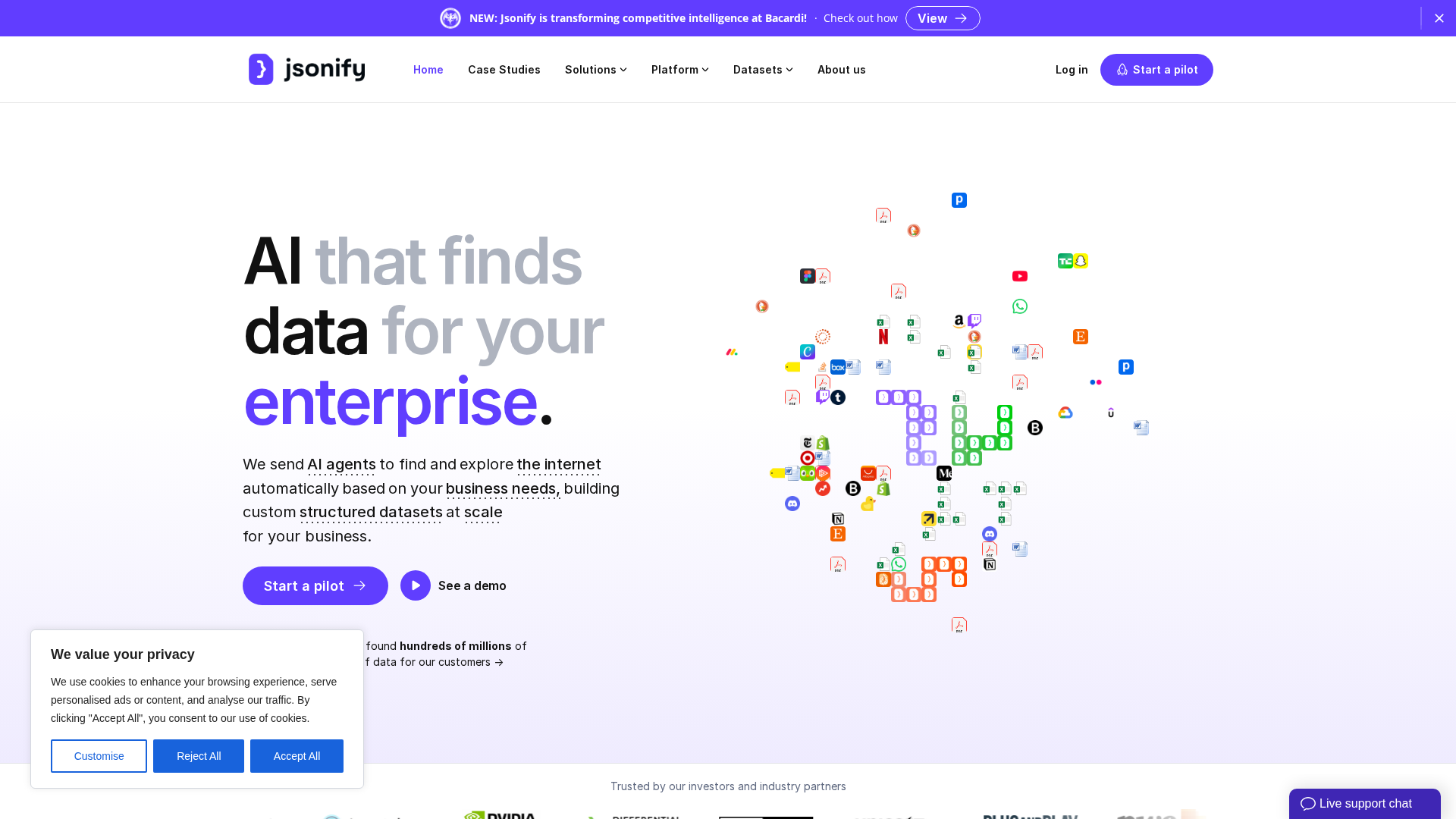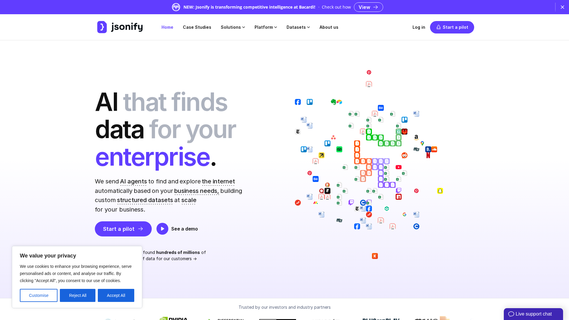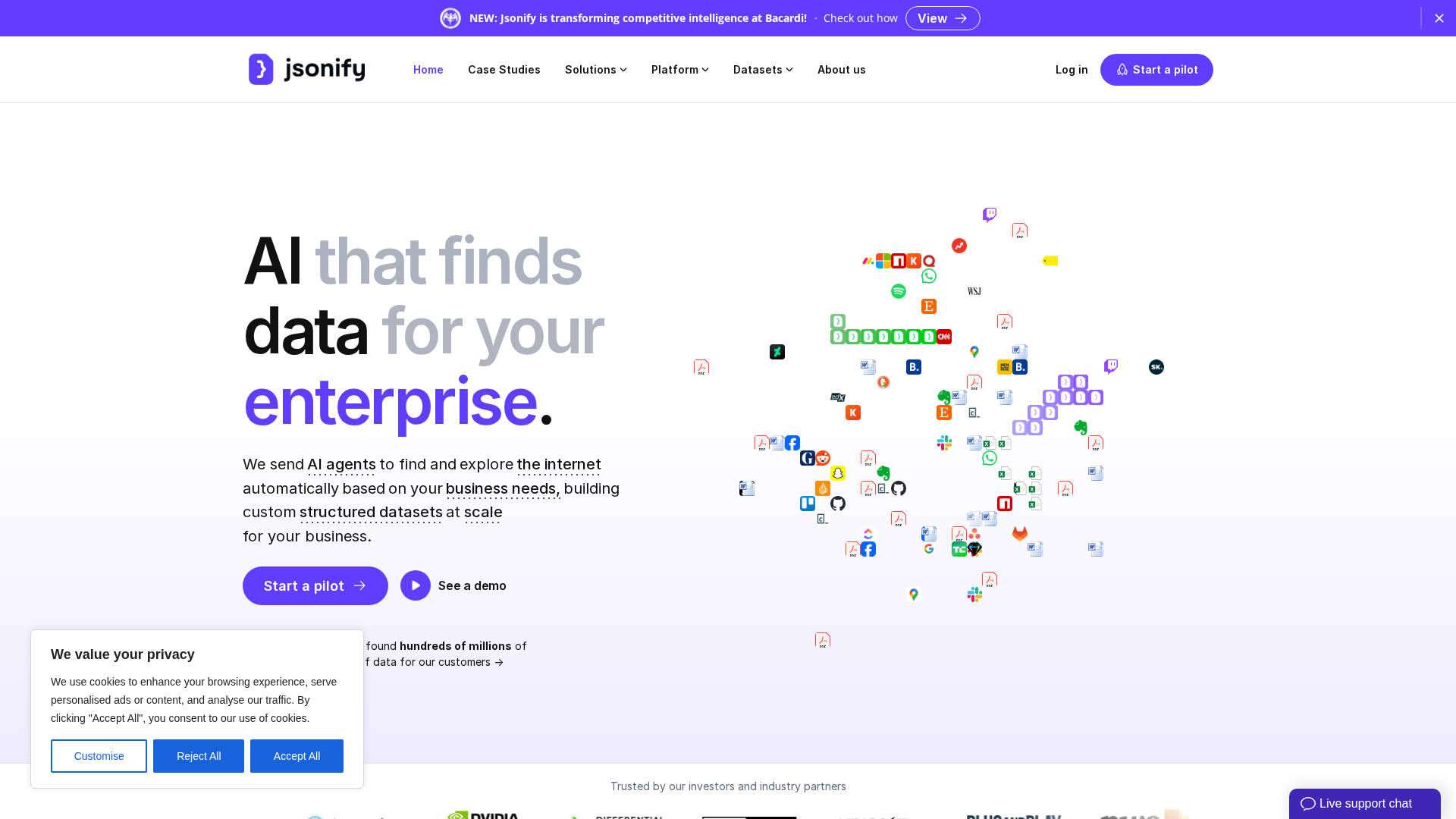 Jsonify deploys intelligent agents that read and extract structured data from very large numbers of sources across the web, documents, and native mobile apps. It uses ordered workflows to run collection tasks in parallel across many sites and sources, combining and massaging results into enterprise-grade outputs (datasets, dashboards, alerts, managed services). Agents can navigate complex sites, parse images and documents, fill forms to access data behind forms, and monitor changes over time. The site emphasizes pilots, managed engagements, and requests for free sample datasets rather than public pricing. Publication timestamp observed on pages: 2025-11-12T00:00:00+00:00.
