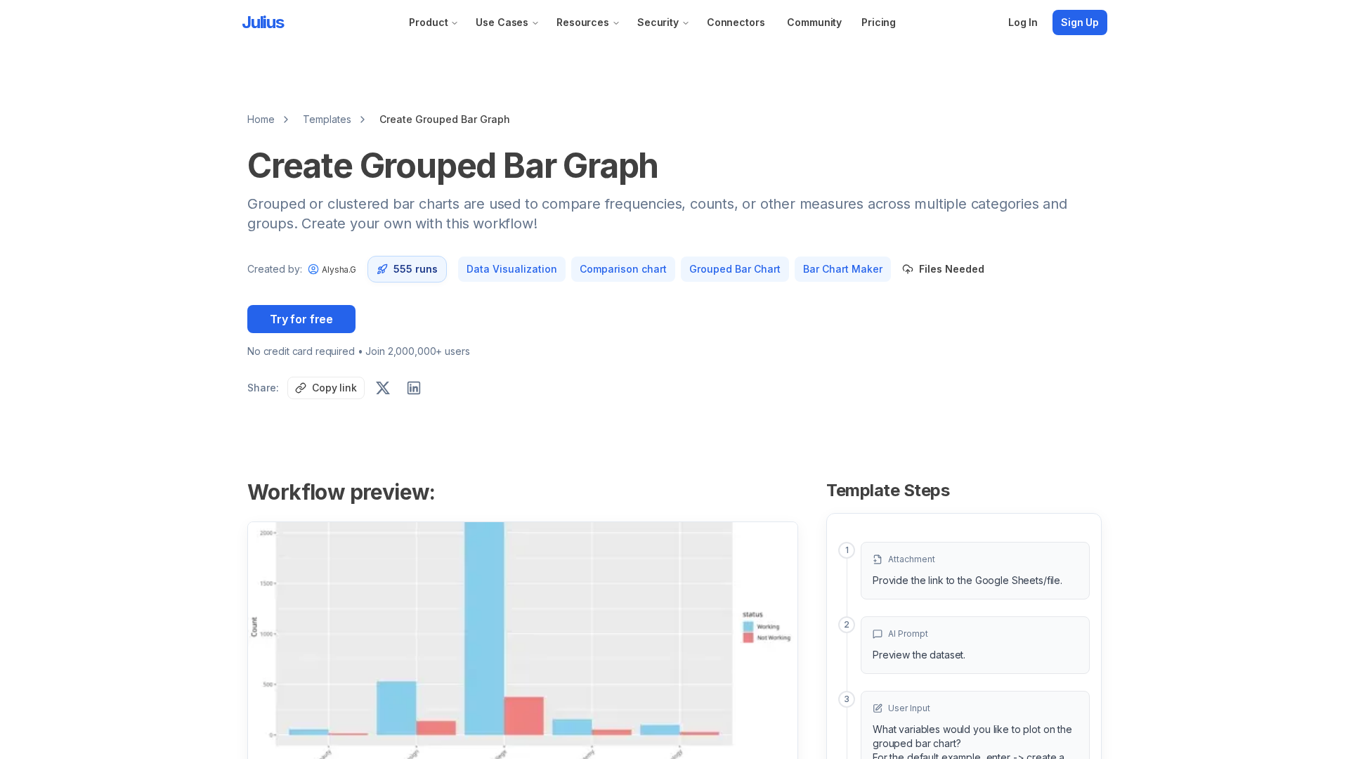 A free Julius AI workflow to create grouped bar charts from various data formats with guided steps.
