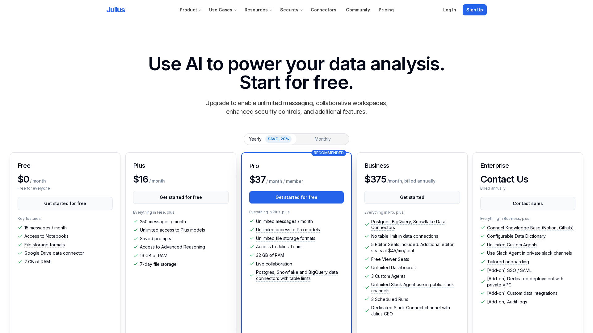 Julius AI is a chat-first data analyst that converts spreadsheets and connected data sources into instant charts, forecasts, formulas, and natural-language insights without code. Target users include analysts, product and marketing teams, educators, and teams that want faster spreadsheet and BI workflows. Company highlights from collected materials: Julius is a YC company led by founder/CEO Rahul Sonwalkar; the site lists a recent seed raise of approximately $10M (July 2025) and public user/usage metrics. Core capabilities include natural-language to spreadsheet actions (generate formulas, create charts, clean/transform data, statistical modeling, forecasting, export to CSV/Excel), a chat interface that retains context and can reference multi-tab spreadsheets, wide input support (.xls/.xlsx/.csv, Google Sheets, images, PDFs, text, uploaded files), and many live connectors (Snowflake, BigQuery, Postgres, Supabase, MySQL, SQL Server, Databricks, Google Drive, OneDrive, Google Ads, Meta Ads, SharePoint, Vertica and more). Team and collaboration features include shared workspaces, shared files and threads, sub-teams, centralized billing, usage dashboards, audit logs, SSO, and RBAC. Julius runs notebook/sandboxed Python execution for computations with ephemeral processing for safety. Security and governance materials list SOC 2 Type II, GDPR compliance, and TX-RAMP; the privacy policy and security/trust pages describe data handling commitments (customer data not used to train models as stated, customer data isolation, encryption in transit and at rest, RBAC, data deletion processes) and provide trust resources and vulnerability disclosure guidance. Pricing follows a freemium model with a Free tier (limited monthly usage), paid tiers including Plus, Pro (listed at $45/month per seat with a $37/month option billed annually shown), and Enterprise/custom quoting; an academic 50% discount is noted for verified students/educators. Recommended evaluation steps: try the Free tier with a representative spreadsheet, follow the Quickstart guide to upload/connect data and run common tasks, connect live data via listed connectors after confirming limits and access scopes, run a small Pro trial or contact sales for team testing (SSO, audit logs, memory limits), and review security/trust pages and privacy policy or request SOC 2/trust-portal details for procurement. For up-to-date specifics (exact message quotas, current feature lists by tier, and any limits) consult the pricing page and documentation directly.