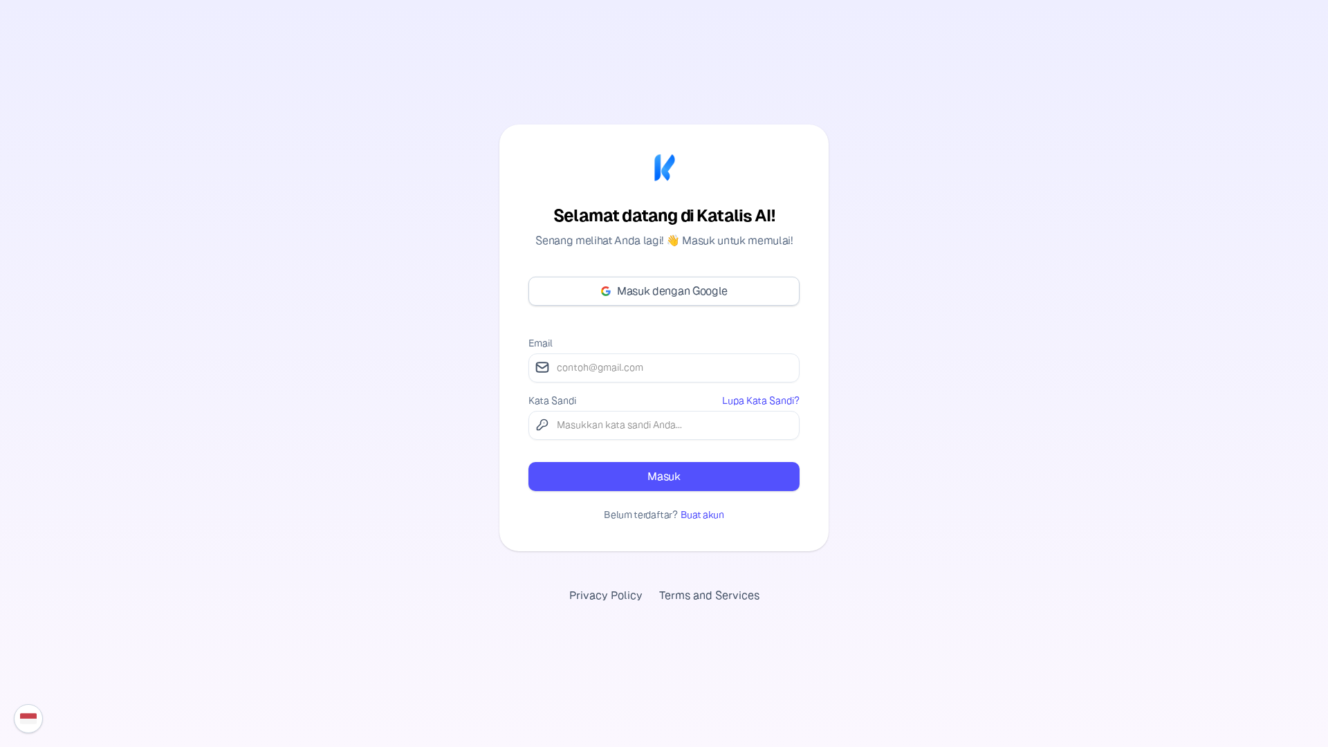 Indonesian landing page for Katalis AI, a product listings and ads generator with Google/e-mail login and bilingual support.