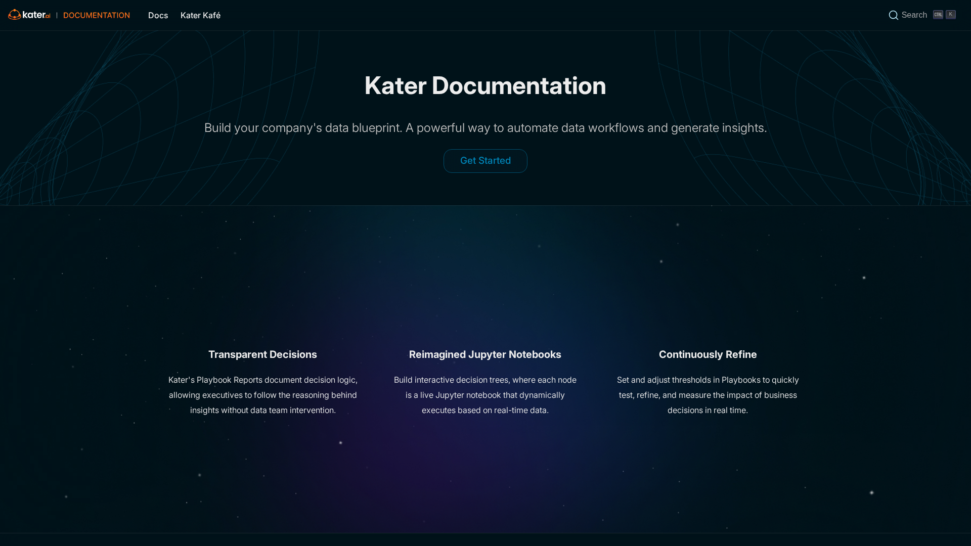 Kater Documentation showcases transparent decision playbooks, live notebook decision trees, and real-time refinement for automated data workflows.