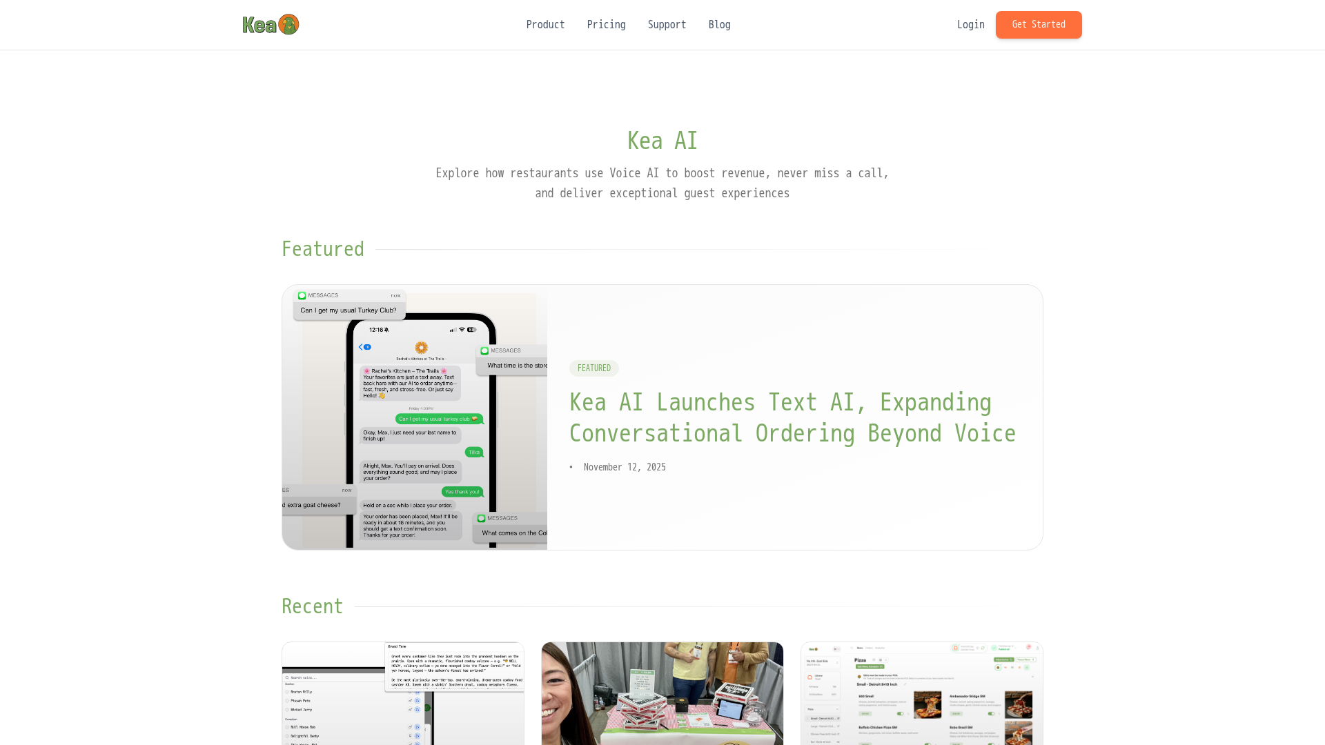 Kea AI is a voice + text conversational platform built for restaurants to capture orders, answer questions, and take payments via voice, SMS, website chat, and related channels. Marketing emphasizes multiple AI agents (named on the site as The Judge, The Food Critic, and The Data Guru) collaborating to ensure menu accuracy, surface real-time menu/FAQ information, and deliver daily analytics. Core capabilities called out on the site include voice AI ordering (site-stated accuracy 99.3%), Text AI (announced Aug 29, 2025) extending conversational ordering to SMS/messaging/website chat, real-time menu and FAQ syncing with flags for unsupported customizations, daily SMS summary/reporting with metrics (calls handled, customer reviews, revenue saved), and Kea Pay which sends dynamic payment links to customers for pickup/delivery orders. The site advertises “11+ direct POS integrations” (examples listed: Toast, Square, Clover, Olo) and references supported telephony providers; setup documentation for POS and telephony is in the support hub. Onboarding is positioned as quick-start with a three-step go-live flow (sign up, connect POS/menu, forward calls and follow the Go-Live guide) and an option to request a demo. Public legal and privacy documentation includes a Privacy Notice, a Supplementary Voice Data Privacy Notice, and a Cookie Policy. The publicly advertised pricing on the site is a flat $450 per month with unlimited calls and no per-order fees, but the site contains inconsistent/garbled copy (for example a stray “Only $15 a day” line) and unclear hints of optional human-support/24/7 staffing add-ons; the site recommends contacting sales or requesting a demo to confirm final terms. Support resources: support hub with step-by-step onboarding and setup guides, documentation for enabling Kea Pay, telephony setup, POS setup, and go-live guides. Contact points visible on public pages include a support phone number and two legal/privacy emails.