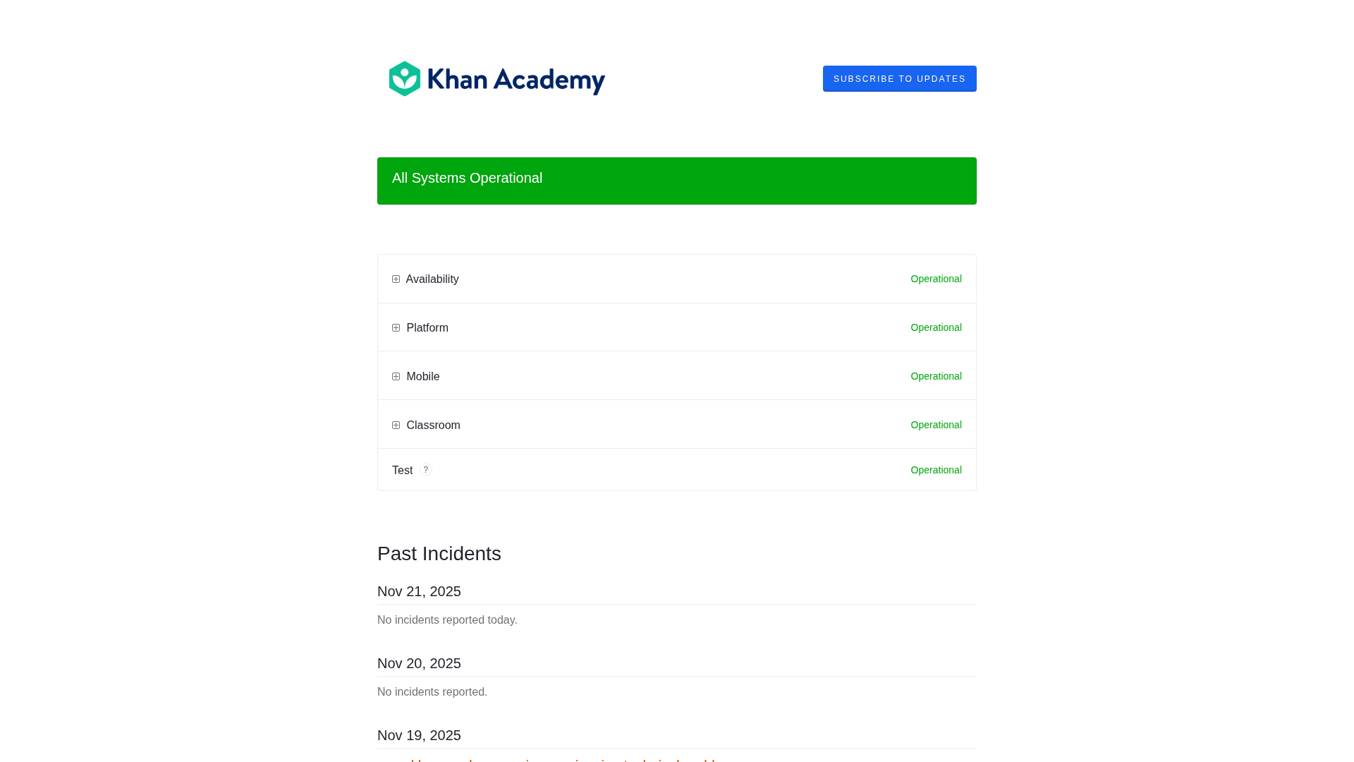 Khan Academy's status page shows all systems operational with no incidents reported today.
