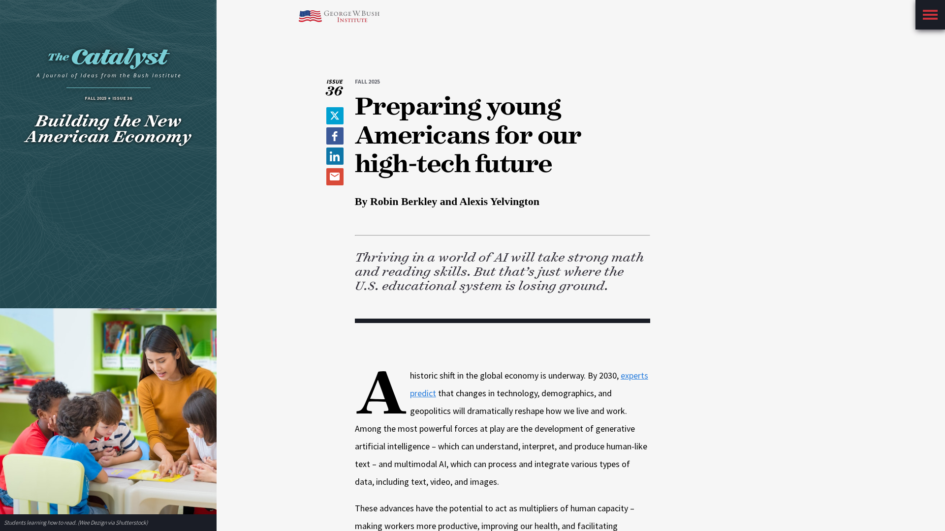 An advocacy piece urging foundational math and reading mastery, with strategic use of AI, to prepare Americans for an AI-driven economy.