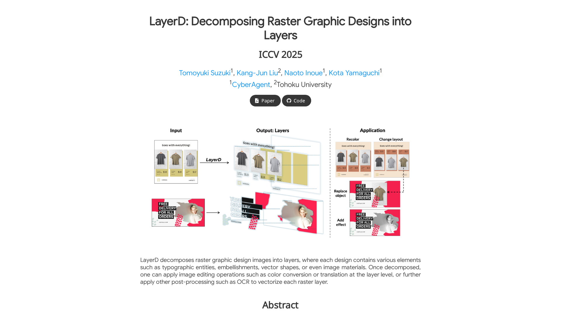 LayerD decomposes raster graphics into editable layers using iterative matting, background completion, and palette-guided refinements.