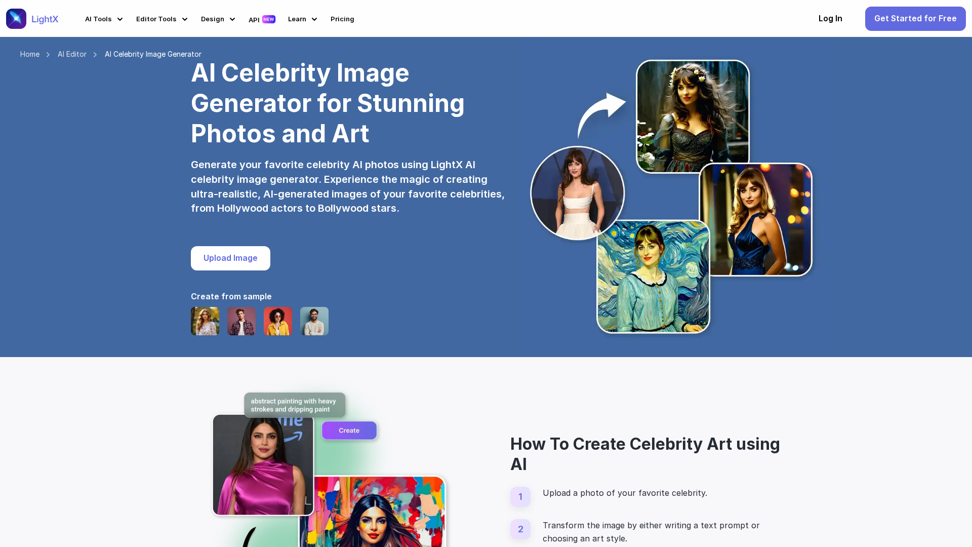 Upload celebrity photos and turn them into stunning AI art and playful characters with LightX’s easy, one-click AI celebrity image generator.