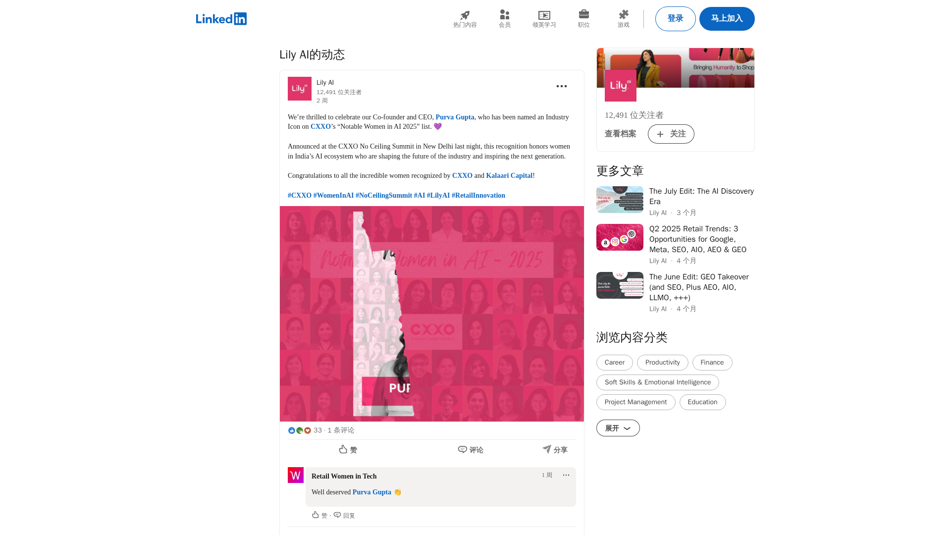 Lily AI announces Purva Gupta as Industry Icon on CXXO's Notable Women in AI 2025 list at the No Ceiling Summit in New Delhi.