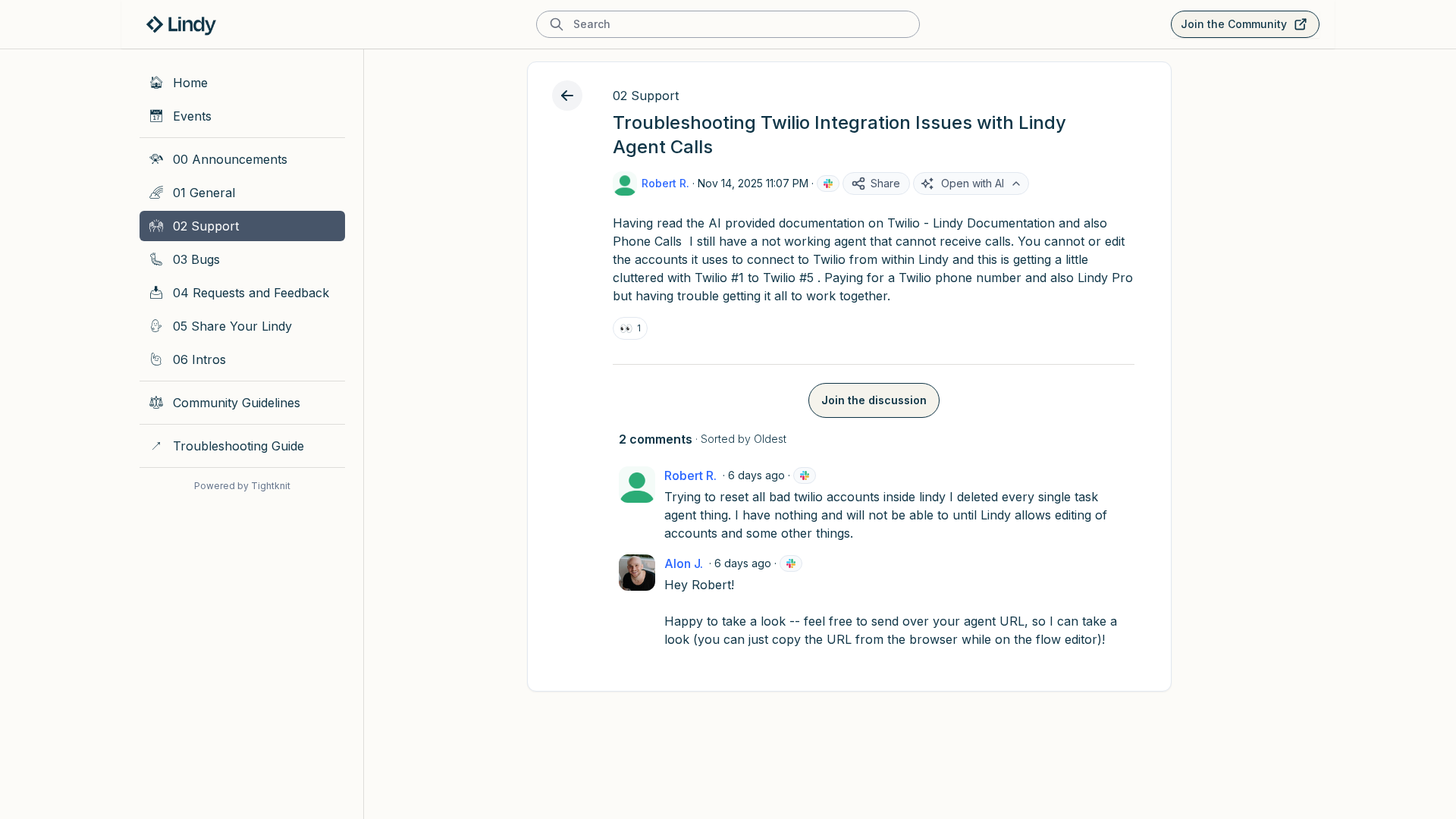 Support-focused post describing issues with inbound Lindy agent calls due to messy Twilio account management.
