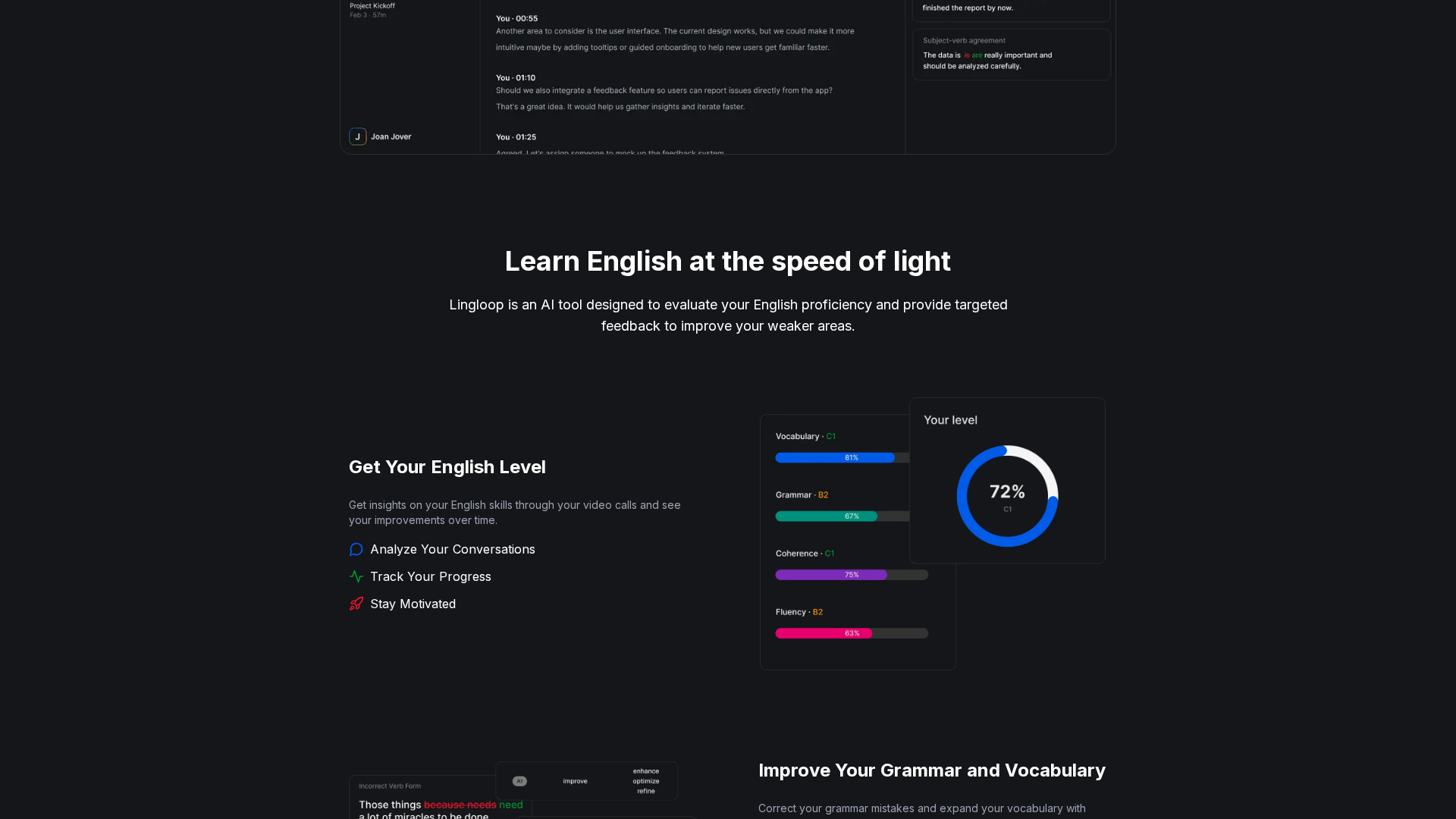 Automatically analyzes spoken conversations from video calls and produces corrections, error highlights, and actionable suggestions.