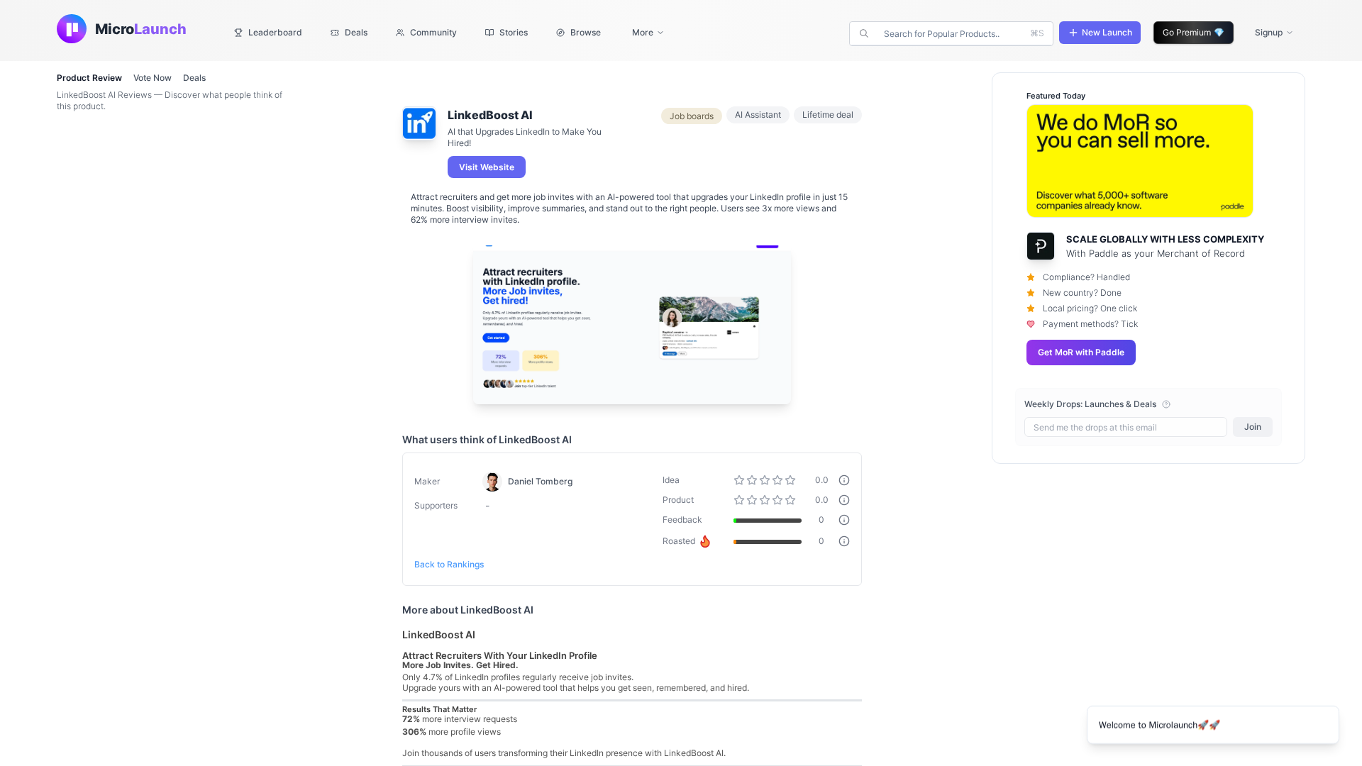 LinkedBoost AI appears to be a web-based service aimed at accelerating LinkedIn growth using AI-driven tools. The homepage states that the service can upgrade profiles quickly and offers features such as profile optimization, AI-written content, outreach and growth-hacking capabilities, analytics, and continuous AI-powered profile updates to stay relevant. It also references simple, transparent pricing. Pricing is described as one-time payments with two plans: Starter and Advanced. Starter is $20 (one-time) with core AI tools to boost a LinkedIn profile and lifetime access; Advanced is $35 (one-time) with additional features such as Job Search Strategy, Career Guides, and Cover Letter Guide, marked as popular. The site notes that the /features page currently returns a 404, and privacy policy details data collection, third-party payment processing, and a contact option. It references privacy policy availability and a contact method, and suggests verifying exact contact email from the policy. External references include the site itself and mentions on aggregators or lists. The text recommends confirming feature details with support before purchase and looking for external reviews.