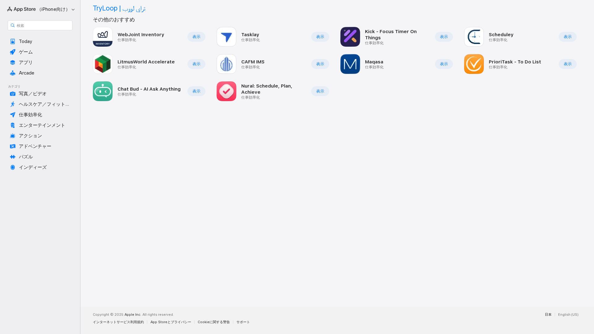 A Japanese App Store page for TryLoop showing related productivity apps in the 'Other recommendations' section.