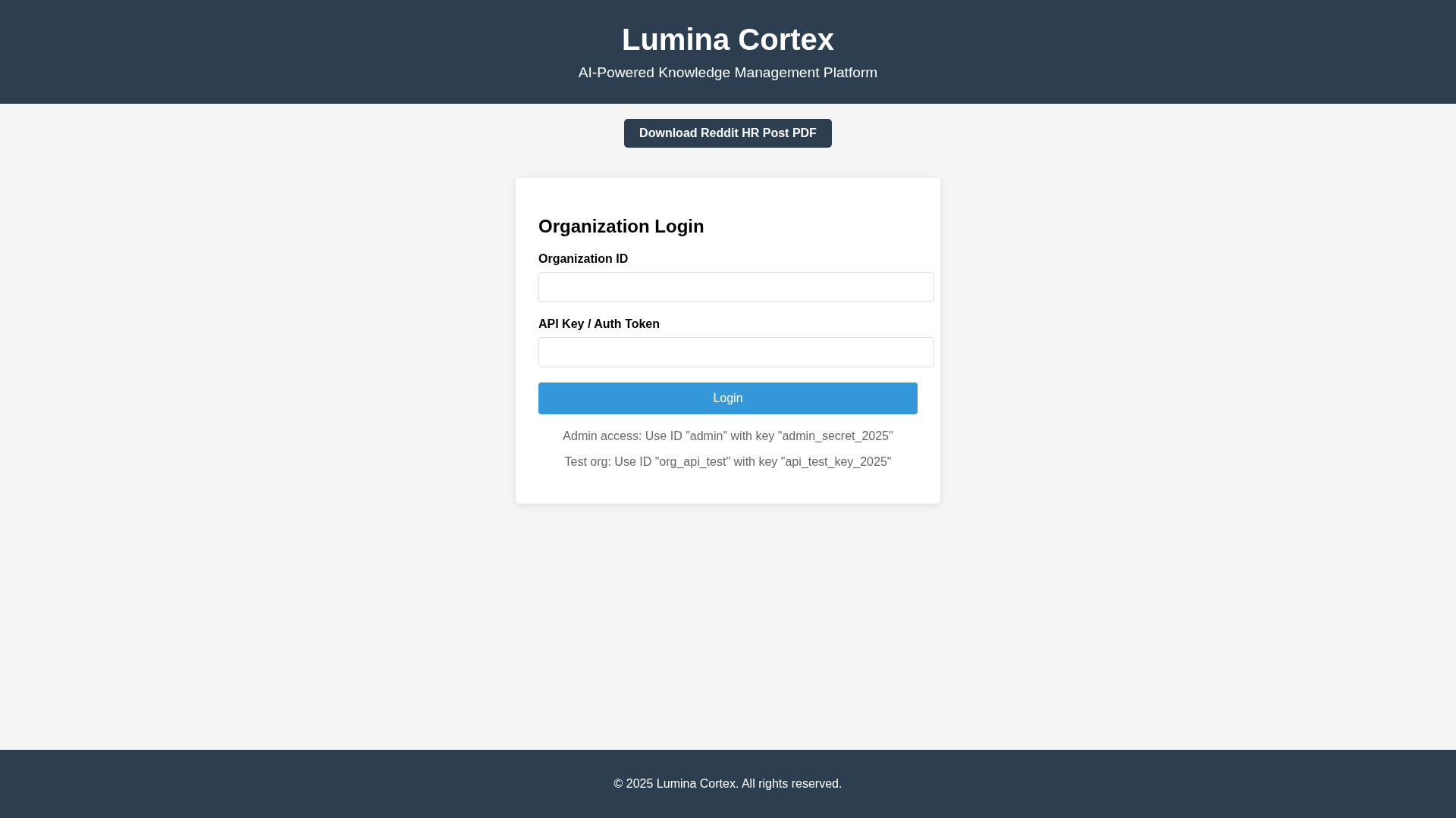 Lumina Cortex is described as an AI-powered knowledge management platform intended for enterprises to capture, organize, and retrieve organizational information. The demo site hints at a built-in onboarding flow with an admin account and a test organization. Across the site, the envisioned capabilities include centralized document and knowledge repositories, AI-assisted search and tagging, and role-based access controls to govern who can view or modify content. The homepage provides only a brief branding overview and lacks in-depth technical details or pricing. A public exploration of the site shows no accessible feature pages, pricing, or documentation; many routes such as /features, /pricing, /docs, and /signup return 404/Not Found, while /login returns 405 Method Not Allowed. Broad web searches yield little official product information beyond the demo, suggesting limited indexed documentation. The result is a fragmented data picture with gaps in feature specifics, integrations, security details, and pricing. The next steps recommend contacting the app owner for public URLs, demo credentials, or product briefs to complete the collection.