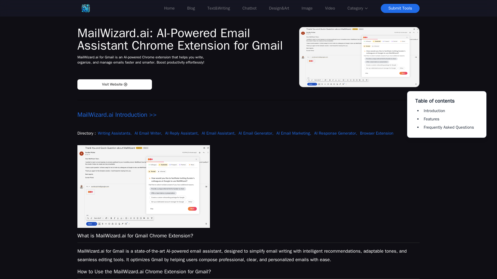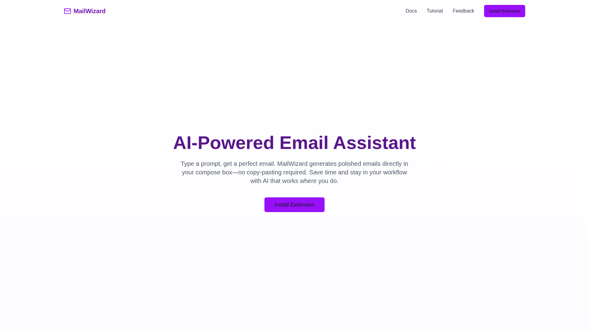 MailWizard is a lightweight Chrome extension that brings AI-powered email drafting directly into your compose box so you can stay in your workflow. Users type a prompt and the extension generates a polished draft using OpenAI or Anthropic models; drafts appear in the email compose window without manual copy-pasting. Installation is performed by downloading the extension ZIP from the project's GitHub repository and loading it as an unpacked extension in Chrome’s developer mode. The project positions itself as a productivity tool for people who write frequent emails and want to reduce repetitive drafting tasks. While the homepage and tutorial text highlight step-by-step setup and example prompts, several secondary pages (pricing, docs, tutorial, install) are currently placeholders or return 404s, indicating the site is early-stage or under maintenance.