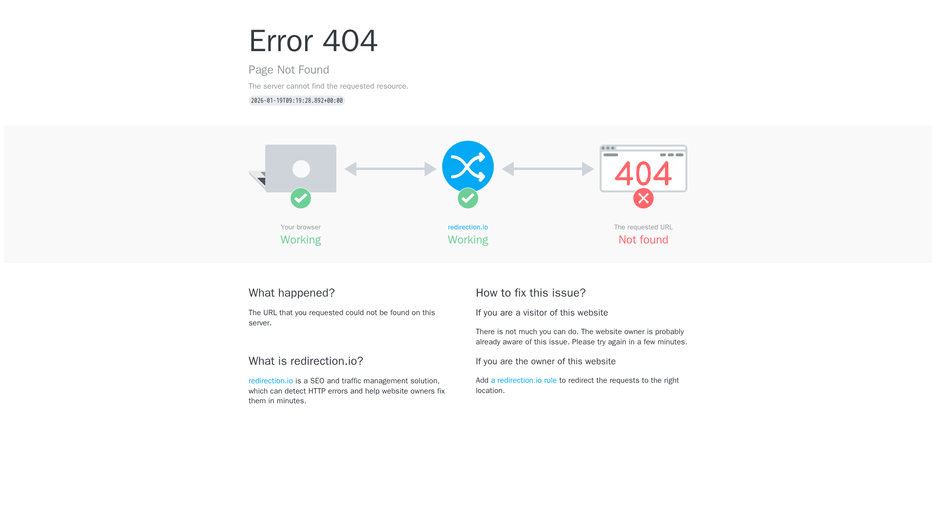A 404 error page promotes redirection.io as a solution to detect and fix HTTP errors, safeguarding SEO and traffic.