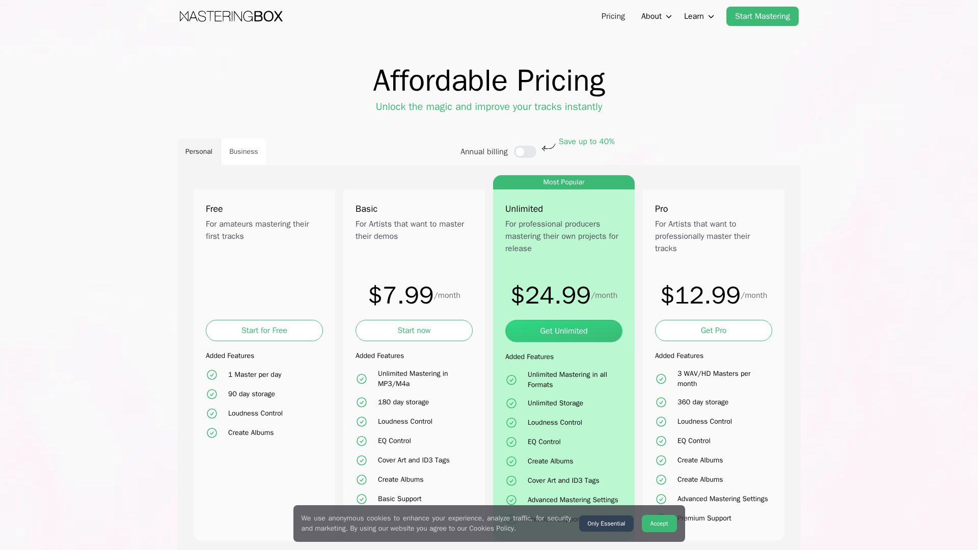 - ✓Affordable pricing tiers and an option for unlimited mastering.