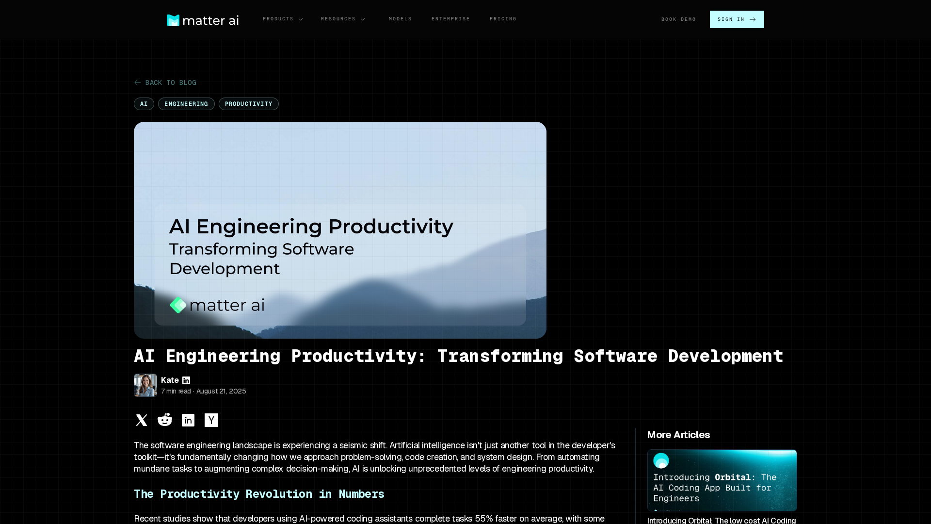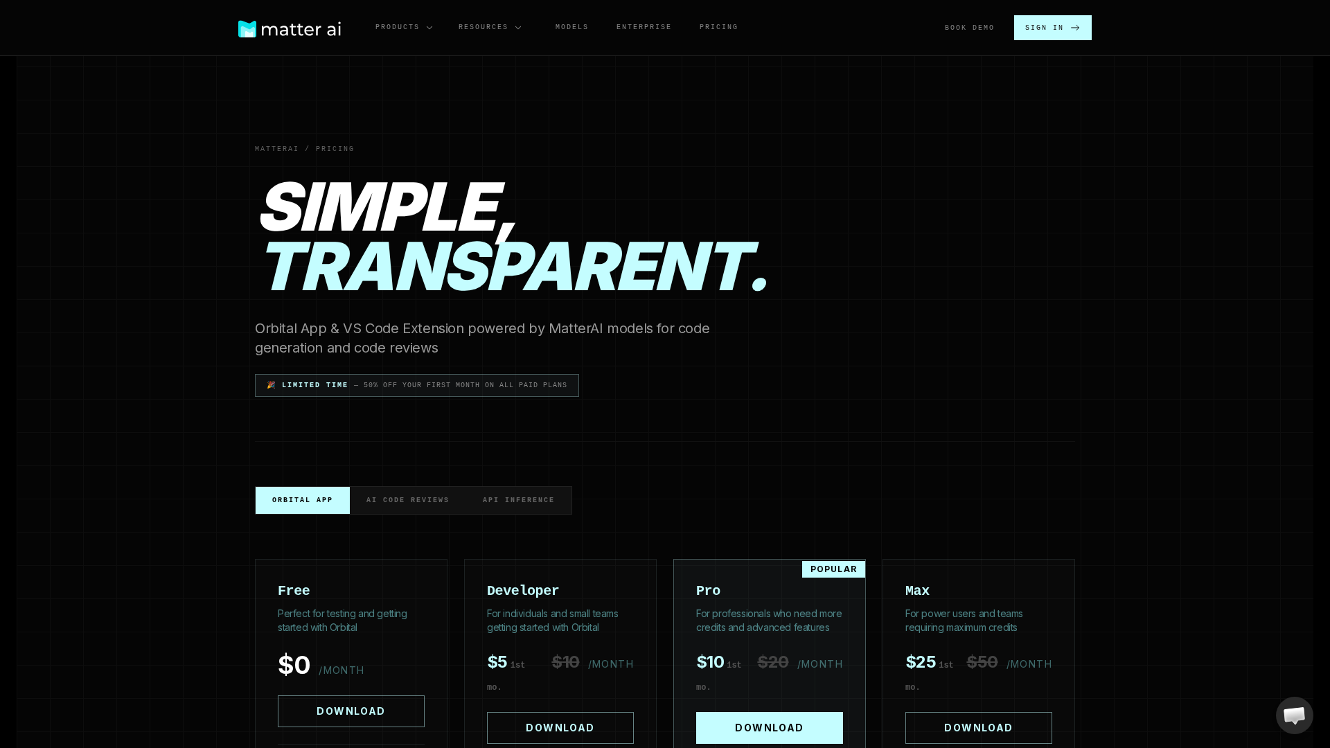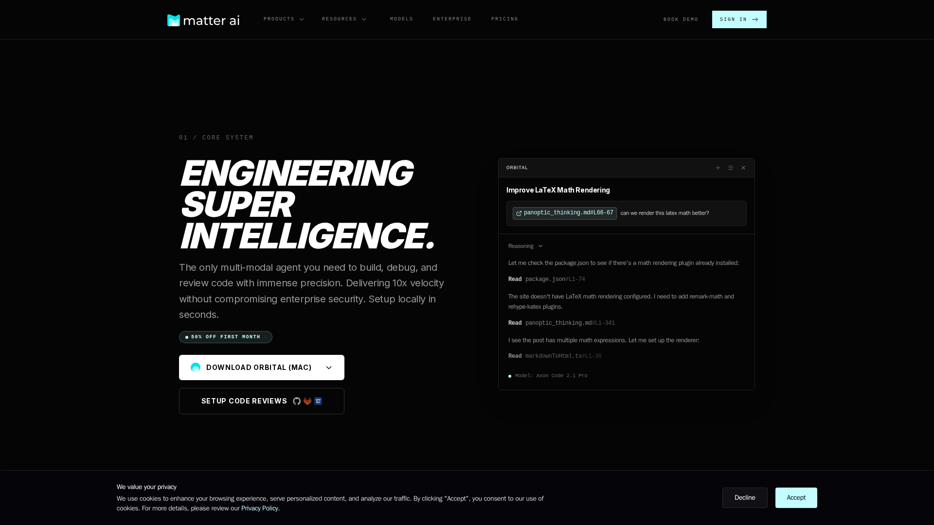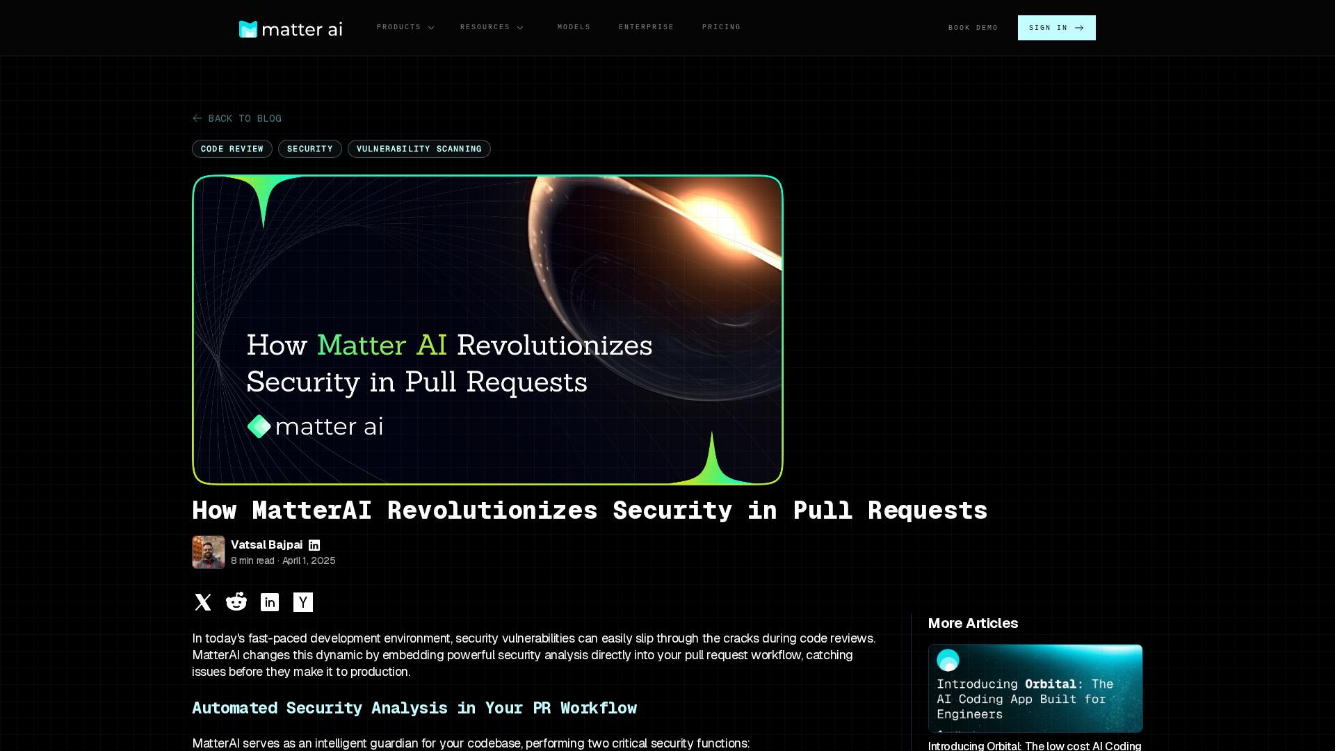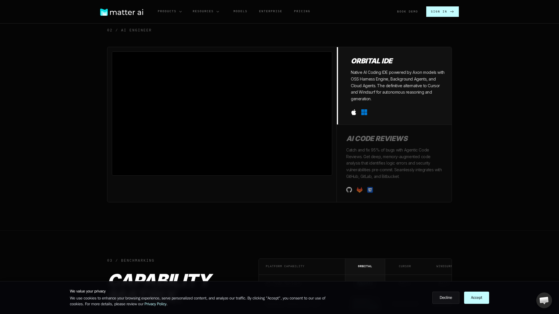 MatterAI is a reasoning-first AI engineering platform that brings autonomous coding, deep code generation, and enterprise-grade security into a single toolset. The platform centers on Orbital — an AI-powered coding IDE that runs Axon LLMs and background agents for tasks such as boilerplate generation, architectural improvements, automated PR reviews, and agentic verification. MatterAI emphasizes long-horizon planning and global reasoning (branded as "Panoptic Thinking") to orchestrate complex workflows beyond typical chain-of-thought approaches. It also focuses on enterprise needs: pre-commit security scanning, SOC 2 Type II credentials, zero-data-retention options, SSO/RBAC, VPC and on-premises deployment choices, and integrations like Jira to bring business context into code reviews. The product targets teams and individual engineers who want faster, secure, and repeatable code review and generation workflows without stitching multiple tools together.