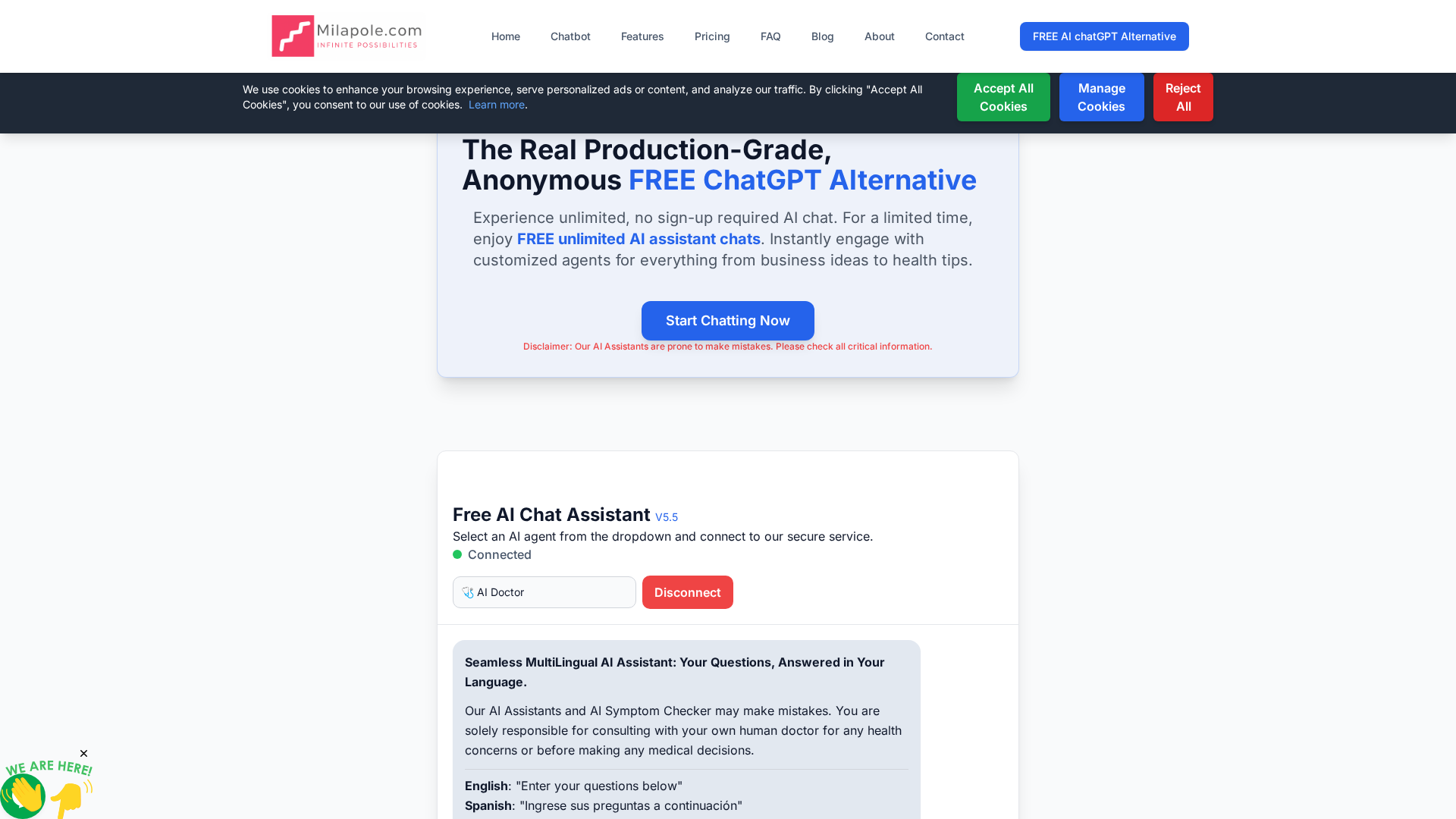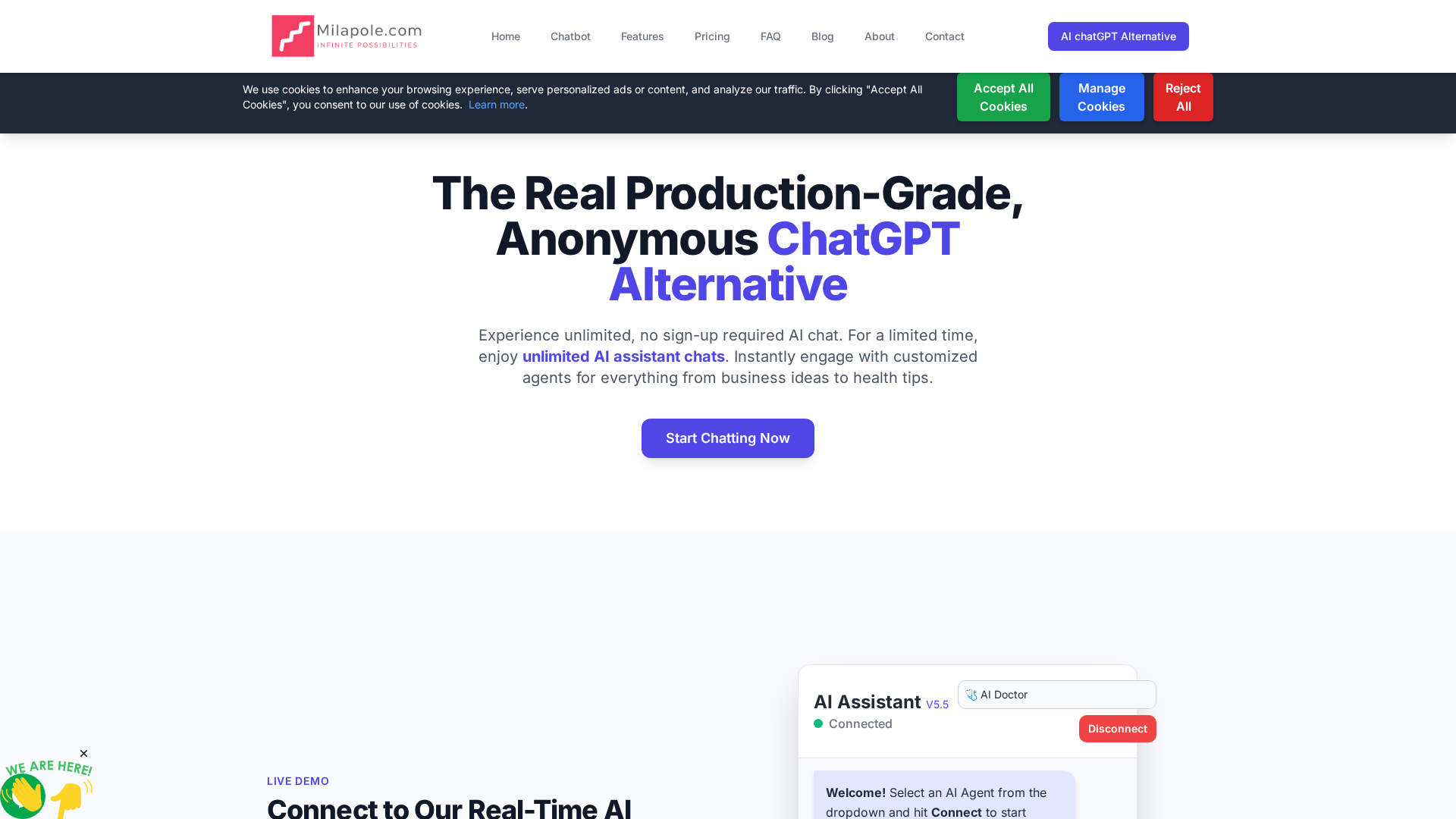 Milapole.com offers an anonymous, production-grade AI agent/chatbot suite that can be embedded into websites using a simple JavaScript snippet. It targets businesses wanting on-site, no-signup conversational experiences and provides a 3-in-1 agent suite (Trivia Bot, Intelligent Pre-sell Bot, and 24/7 Customer Service Bot). The service supports multilingual automatic detection (26+ languages), can be trained from a site’s FAQs and content, and is hosted on AWS with configurable UI. Milapole markets both a free anonymous tier and paid plans including a subscription agent plan, a one-time Lifetime Deal (LTD) option, and a high-value Fractional AI Developer service for custom enterprise engagements.