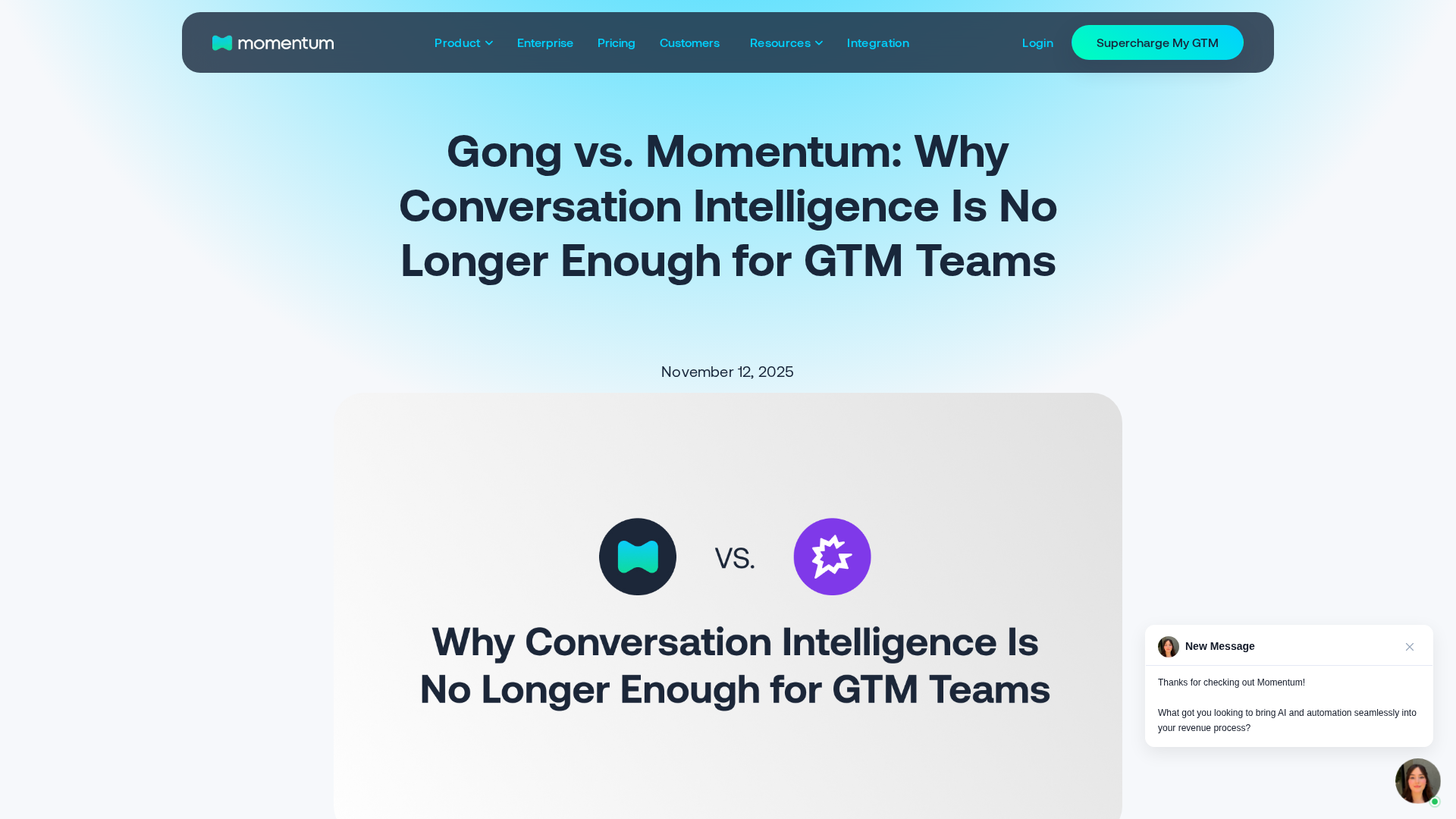 Compare Gong's post-call analysis with Momentum's real-time AI agent that automates CRM updates and cross-functional GTM workflows.