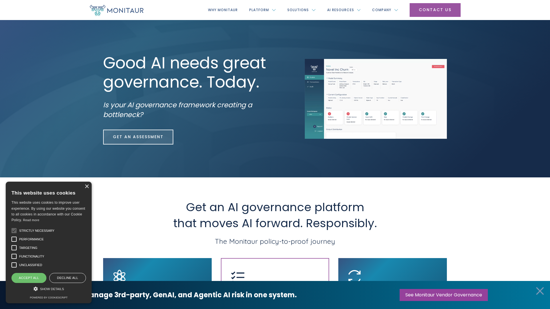 Monitaur is an enterprise AI governance platform founded in 2019 (Boston) focused on insurance and other highly regulated industries. Leadership: CEO & co‑founder Anthony Habayeb. Recent funding: $6M Series A (closed May 2024). The platform combines program services (policy review, program design, risk assessment, education, gap analyses, launch planning and role mapping) with a core product that provides a complete inventory/system of record for models and use cases, a reusable common controls library (~33 flexible controls noted on site), collaborative workflows and ownership mapping, vendor/third‑party governance patterns, a pre‑deployment "Flight Simulator" for validation, continuous monitoring (drift, bias, performance), stress testing and robust validation for high‑risk models, and automated decision logging and evidence collection for audit readiness. Monitaur emphasizes measurable fairness work (disparate impact, multi‑dimensional operating bounds) and linking technical performance to business value. Notable outcomes cited on the site include an insurance case study (90 days) reporting roughly 30% cost savings (vs outsourcing), design-to-delivery in 90 days for key policies and controls, and a 3x increase in AI project inventory within 6 months; a Fortune 200 example (Forrester/press) reported 8x growth in AI model inventory in six months and fast policy/risk implementation timelines (32–46 days). Recognition: named a Strong Performer and Customer Favorite in The Forrester Wave: AI Governance Solutions, Q3 2025. Mentioned customers/partners include Progressive Insurance, CAPE Analytics, Nayya, and a strategic partnership with PwC Germany. Public pricing is not published (site pricing page returns 404 / "Not Found"); Monitaur directs inquiries and demo/pricing requests to contact channels ([email protected], contact forms, LinkedIn). Key public pages captured: homepage, platform, solutions/governance program, insurance case study (90 days), company/about, Series A press release, and a Forrester announcement/info page. Recommendations for next steps: contact [email protected] or request a demo for pricing/licensing details; request API documentation, SOC/ISO/compliance attestations and sample evidence exports for technical due diligence; request references (one insurer and one Fortune 200 example), an implementation timeline, and an SOW for a pilot or 90‑day onboarding.