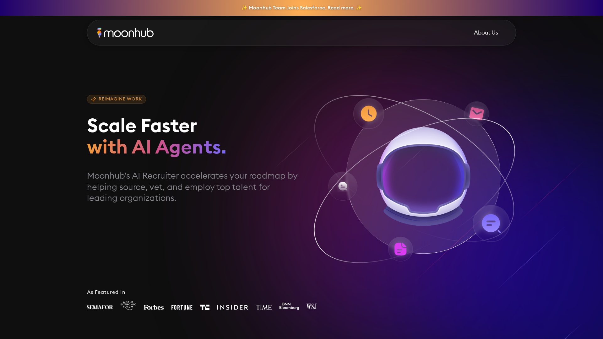 Moonhub is an enterprise-focused, AI-native hiring platform that uses continuous agentic AI workflows — Qualify, Engage, Monitor — to source, outreach to, and monitor candidates at scale. Core site-presented capabilities include: Qualify AI (identifies most qualified candidates from very large public data pools), Engage AI (outbound outreach at scale with personalized messaging), and Monitor AI (real-time analysis of candidate intent for handoffs and follow-up). Moonhub presents a Human+AI model where expert talent partners configure and manage searches and handoffs. The company also advertises enterprise services such as global employment support, centralized payroll and compliance, talent management integrations, and analytics. Claimed outcomes on the site include ~80% of Moonhub-presented candidates being interviewed by clients, ~50% reduction in time-to-hire, and ~75% of candidates in initial pipelines being first-time candidates. The site contains a news announcement that the Moonhub team has joined Salesforce (news page “Moonhub Team Joins Salesforce”, dated early June 2025) — described on-site as a team/people integration. Pricing and plans are not publicly listed; the site encourages enterprise engagement via “Schedule a call” and “Join Waitlist,” indicating custom/enterprise pricing and sales-driven onboarding. For definitive corporate/legal details or transaction terms, official filings or press releases should be consulted.