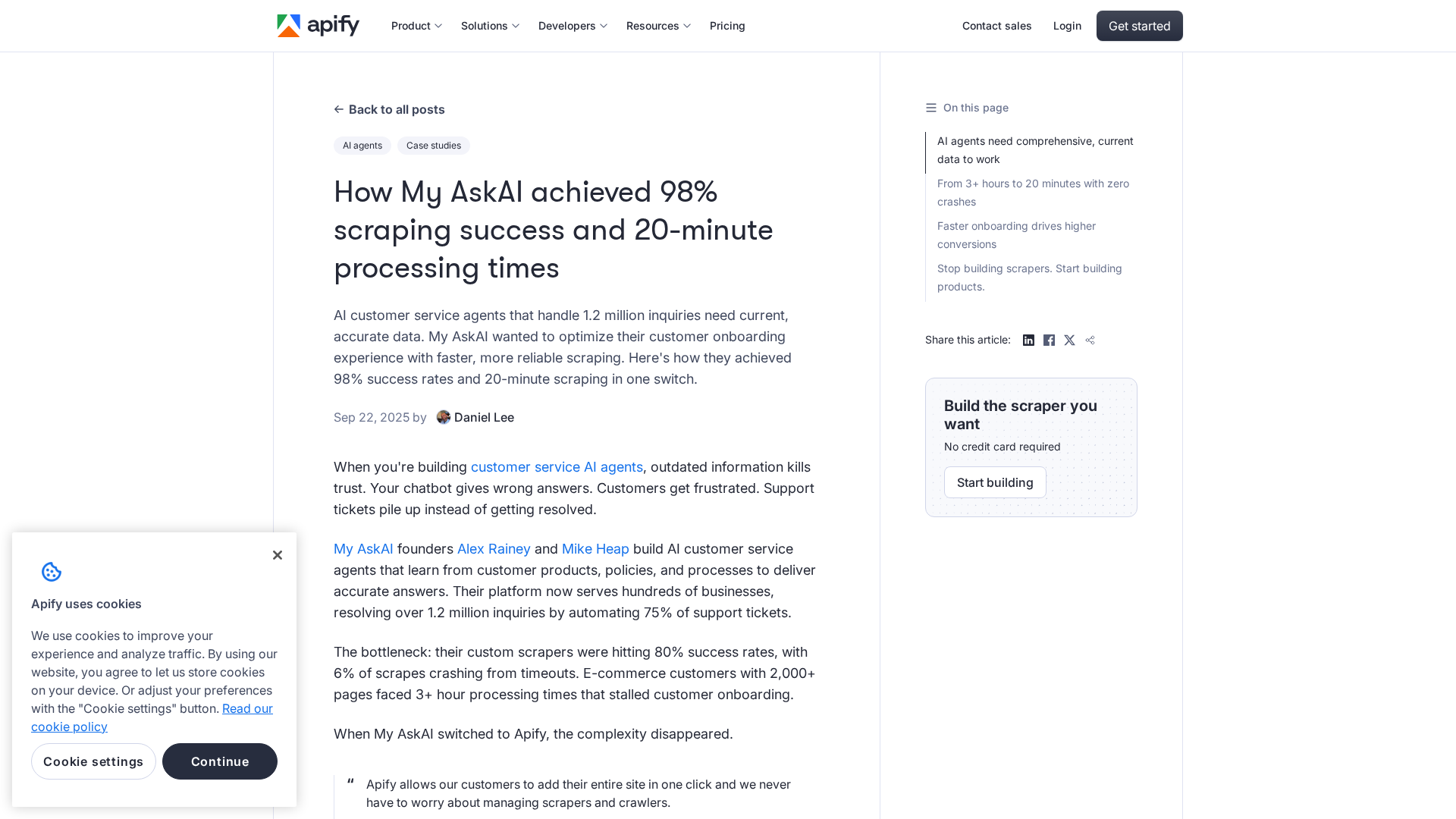 A MyAskAI case study: 98% scraping success and 20-minute processing with Apify’s Website Content Crawler.