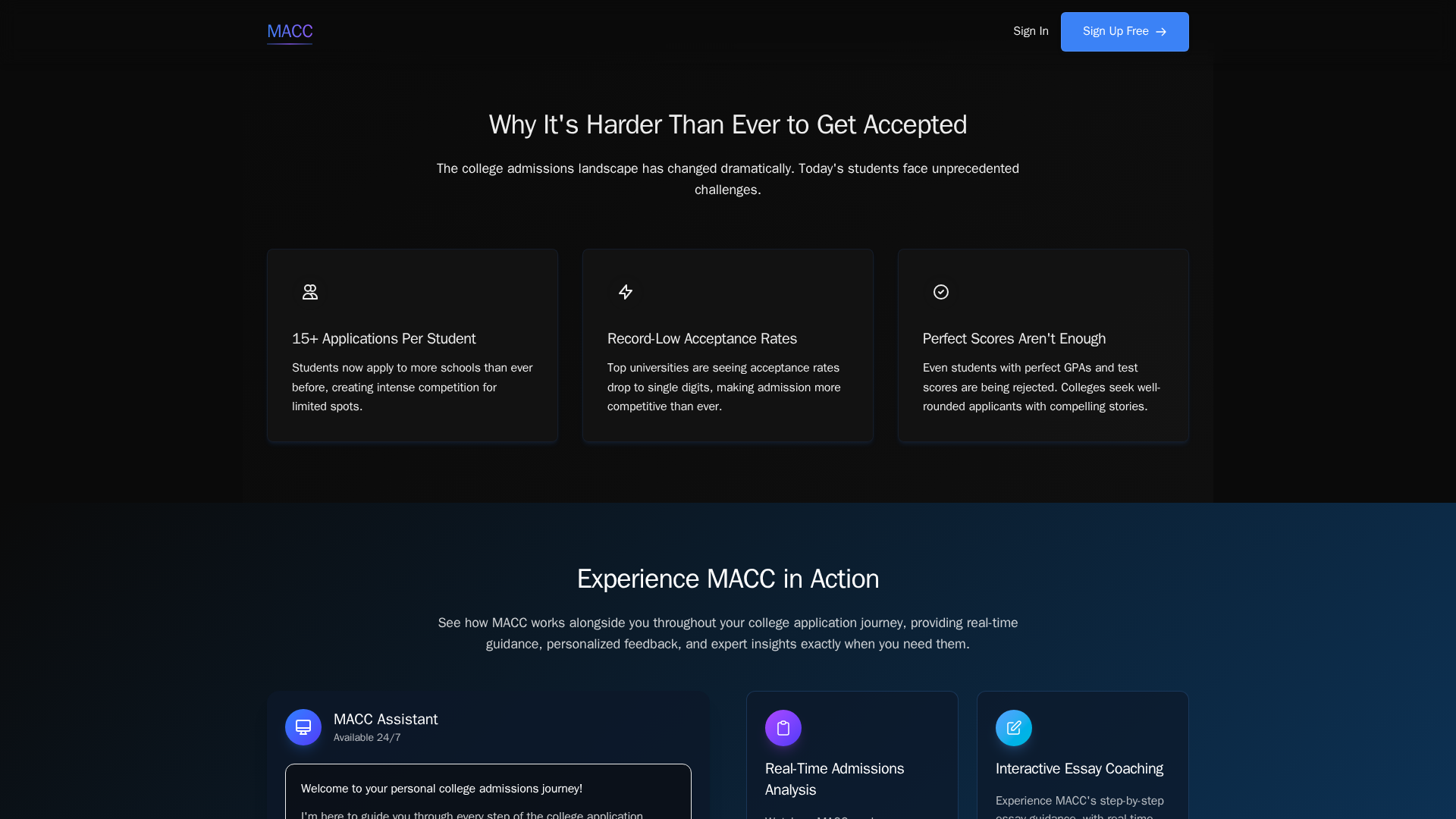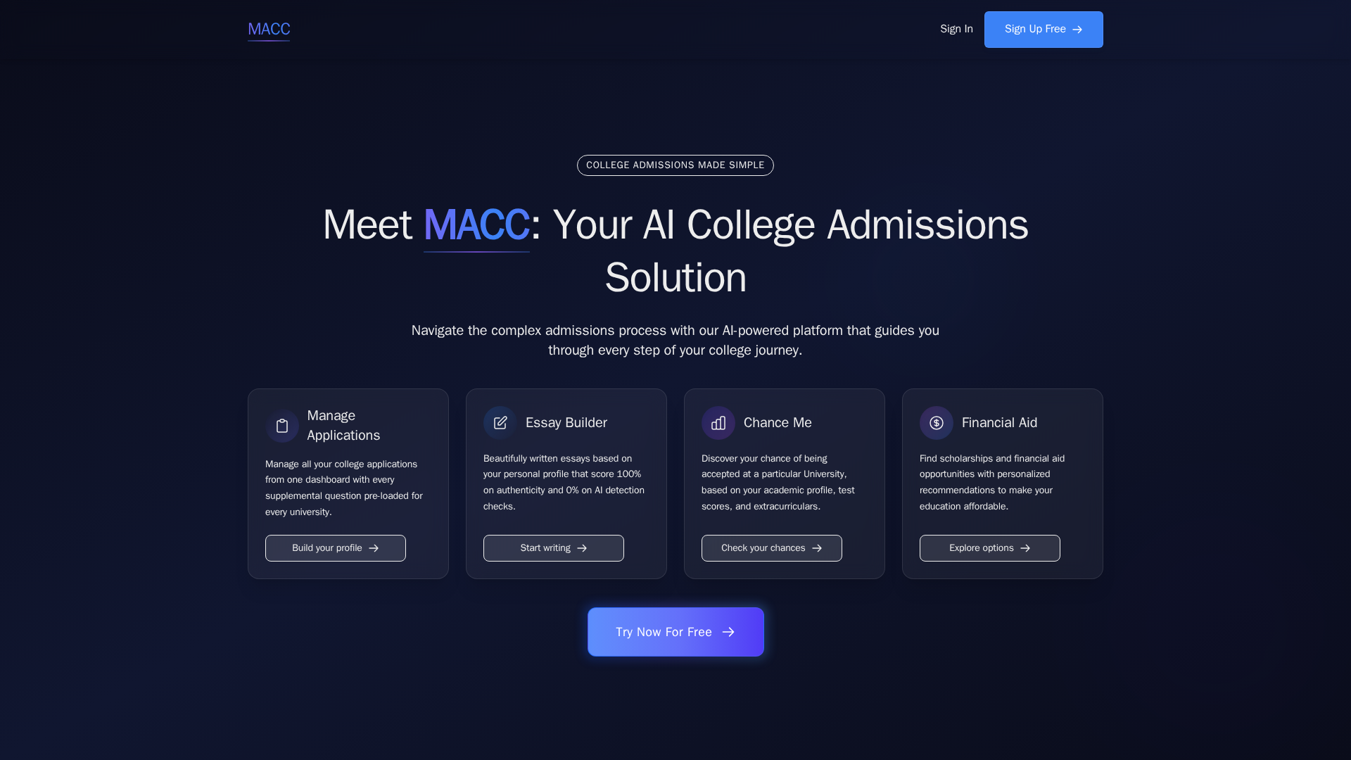 MACC (My AI College Counselor) is an AI-powered platform that centralizes the college application process into a single dashboard. It claims to pre-load each university's supplemental questions, provide essay-writing and interactive essay coaching that preserves a student's unique voice, and forecast admission chances by analyzing transcripts, test scores, and extracurriculars. The platform includes a Scholarship Discovery Engine that continuously scans for personalized scholarship opportunities and offers action-oriented guidance to improve outcomes. Collaboration features let families, school counselors, or private consultants join a shared dashboard for coordinated application management. The product emphasizes data-driven admissions analytics, writing support, and financial-aid discovery to simplify and de-risk the admissions journey.