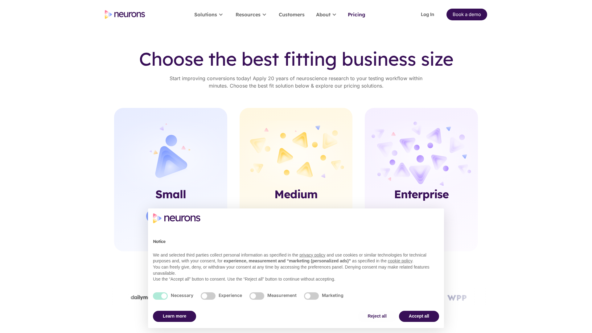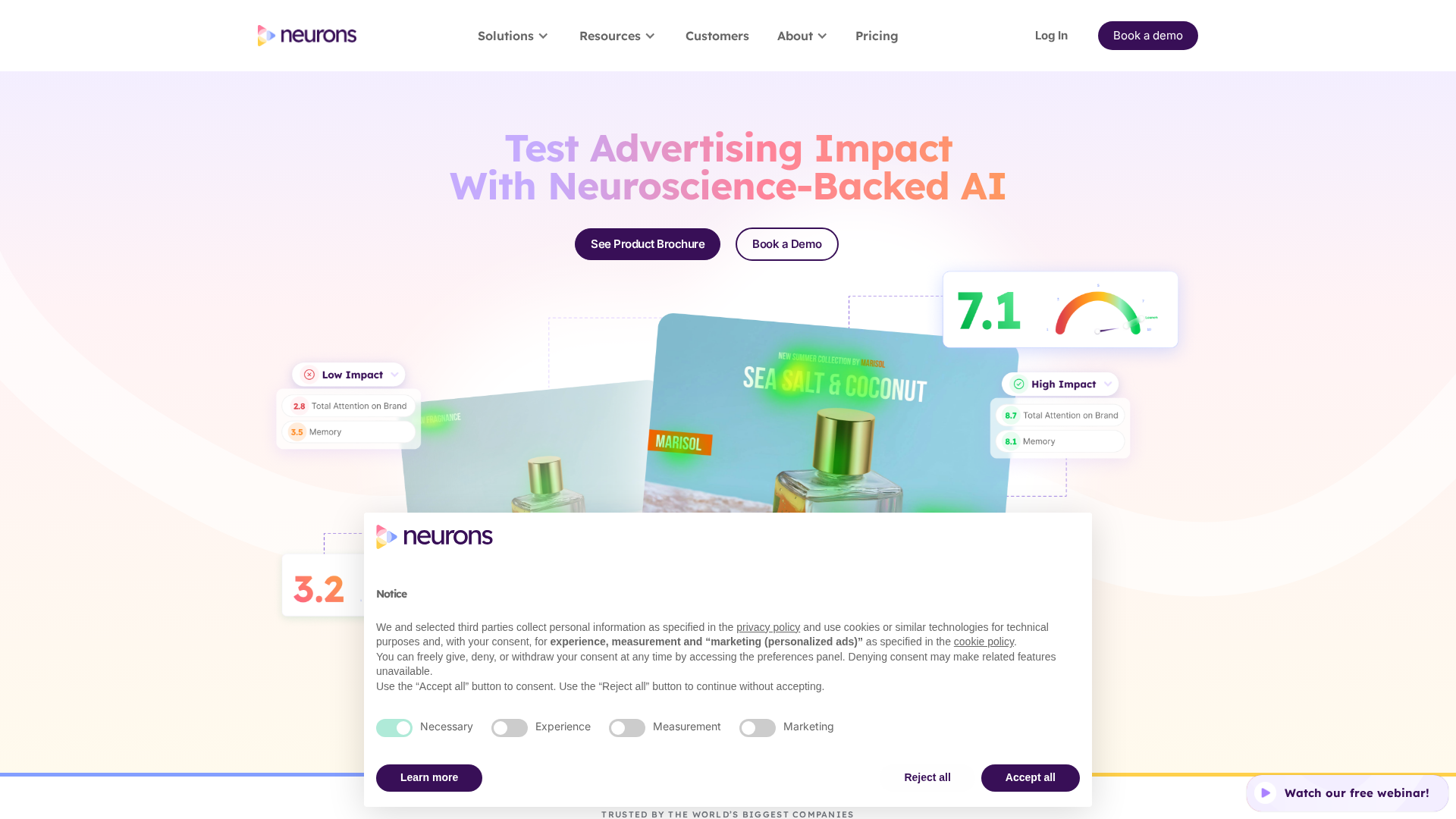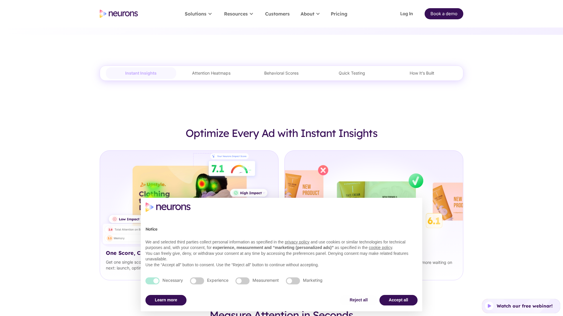 Neurons AI is a neuroscience-driven marketing AI that predicts attention, memory (recall), engagement, trust and related behavioral metrics for image and video creatives. The product provides fast eye-tracking heatmap predictions, Memory & Engagement metrics with AI recommendations, industry benchmarks, batch processing for large volumes, reporting and collaborative workflows, and a RESTful JSON API for integrating predictions into dashboards, CMS, DSPs or product workflows. The company emphasizes cognitive neuroscience, machine learning and psychology as the scientific basis for its metrics, highlights ethical AI practices, and claims enterprise-grade security and GDPR compliance. Pricing is quote-based (Small, Medium, Enterprise tiers) with no published list prices and no public free trial; prospects are encouraged to request demos or submit a "Get my quote" form. Notable product updates include folding VisualEyes eye-tracking predictions into Neurons AI and launching the Memory & Engagement metrics while sunsetting some earlier beta scores. Proof points cited on the site include case outcomes such as an agency reporting approximately a 43% CTR increase. Company background notes the founder is neuroscientist Dr. Thomas Ramsøy.